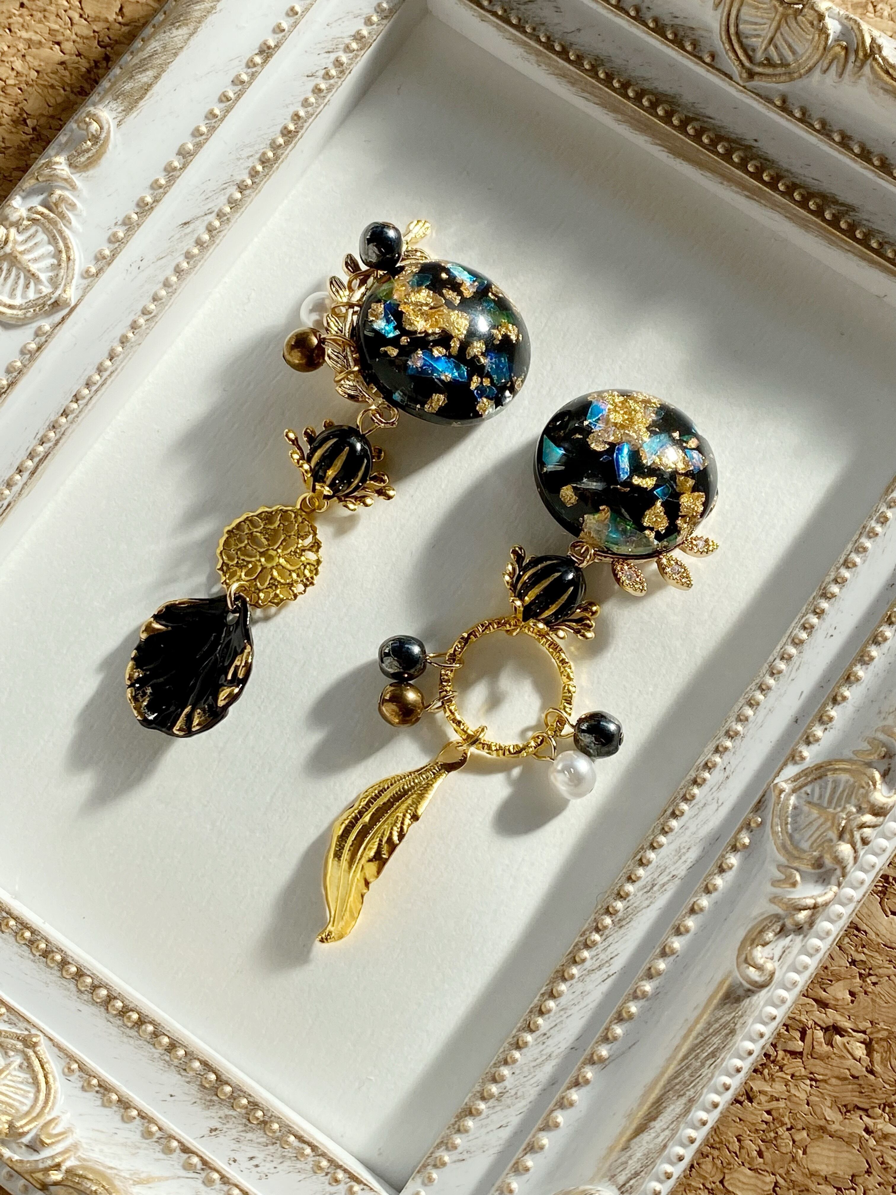 向かって左のデザイン:レジンに金箔とシェルを封じ込めたメインパーツにカーブしたリーフパーツを組み合わせ、その枝に実がなるようにメタリックグレーとブラウン、ホワイトパールのビーズを組み合わせています。チャーム部分は縦筋の入ったボールピアスや花びら型のモチーフを組み合わせました。