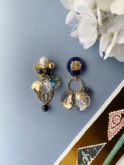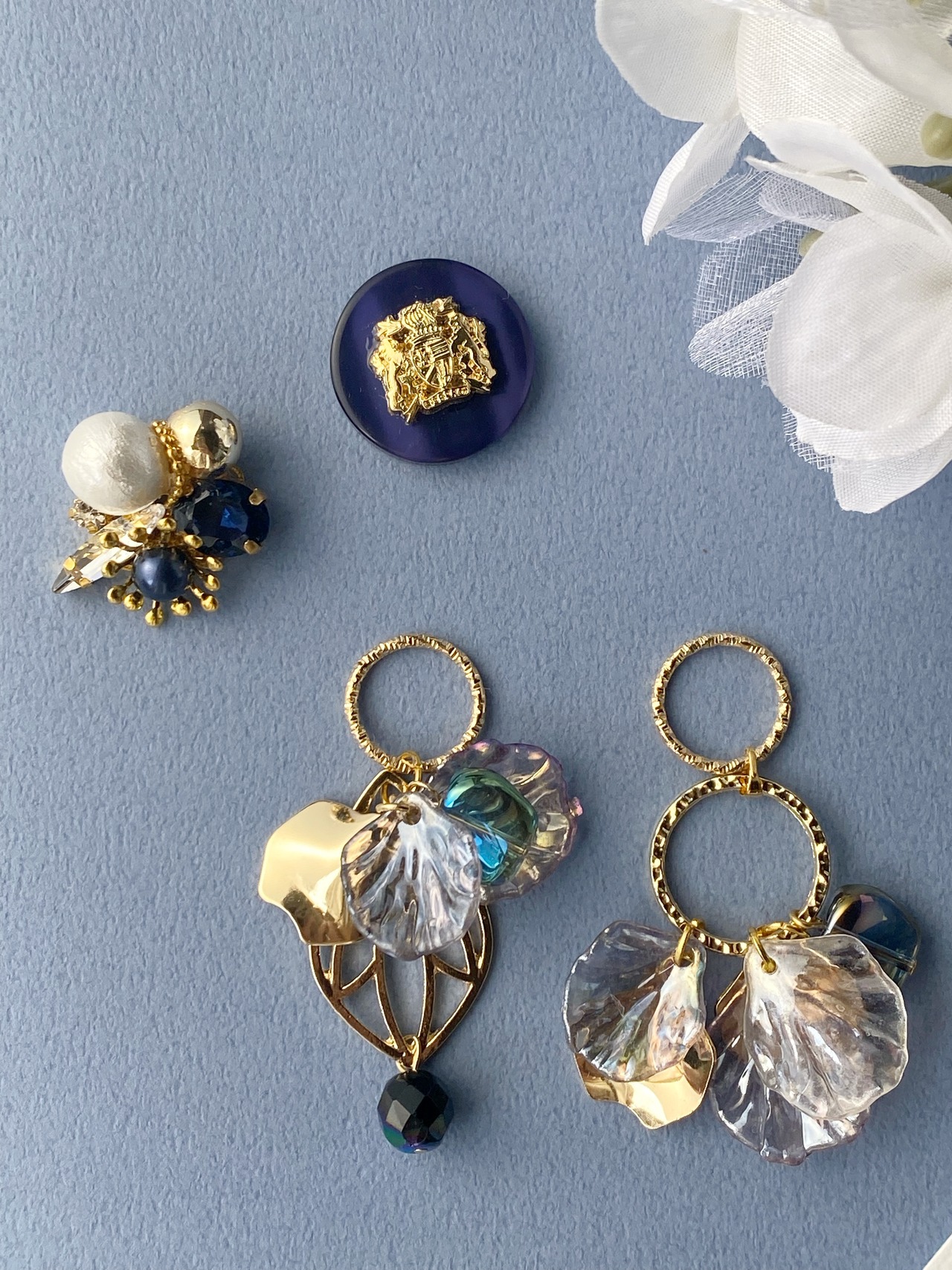左はコットンパールやゴールドや紺色のビーズ、ビジューを組み合わせています。右は見る角度によって色味が微妙に変わる紺色のボタンを使っています。どちらもチャームはぶら下げて使うことのできる2wayとなっています。