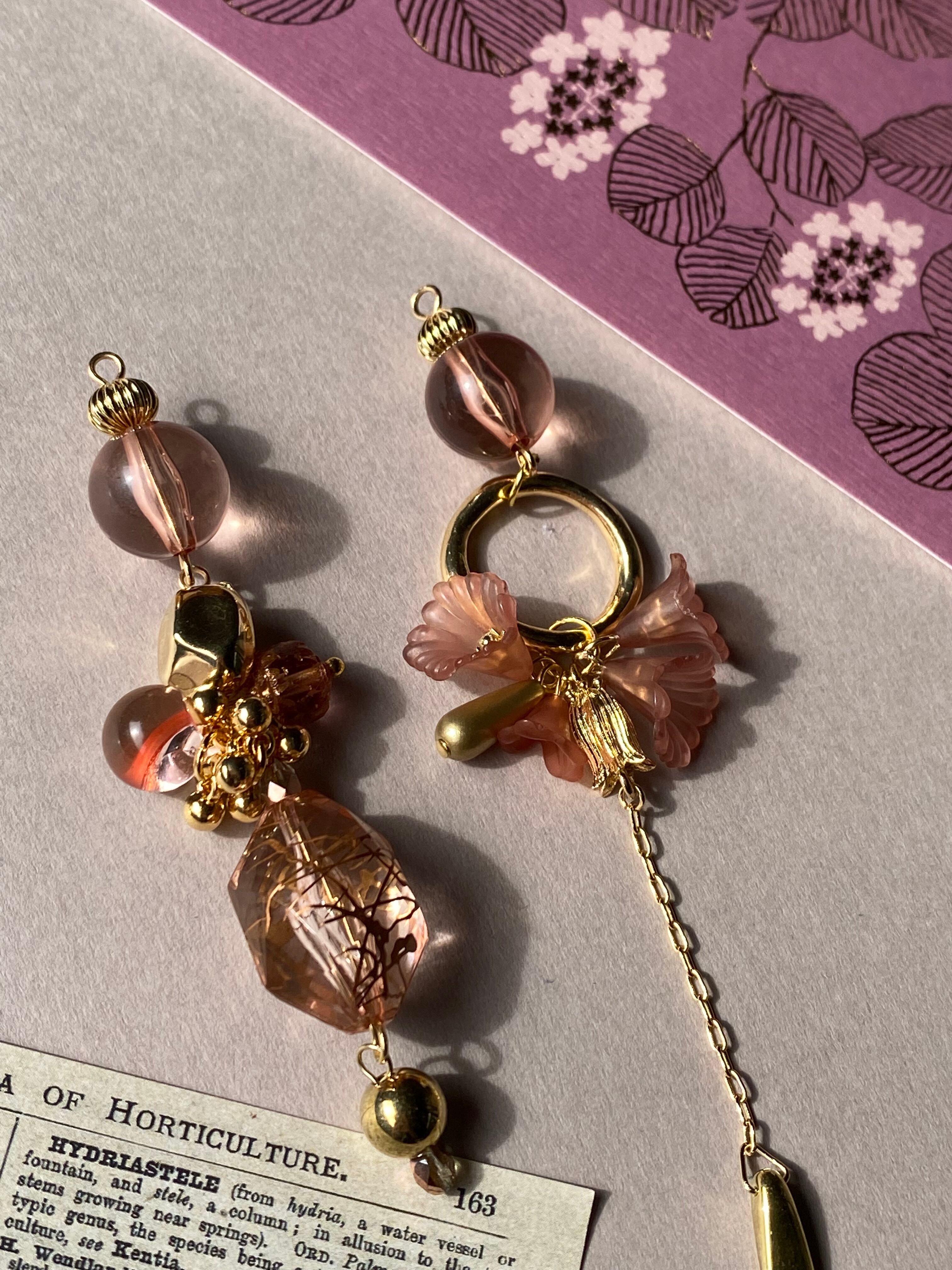 オリジナル染色のブラウンピンクビーズやアクリルパーツとゴールド系パーツを組み合わせたアシンメトリーピアス・イヤリングです。