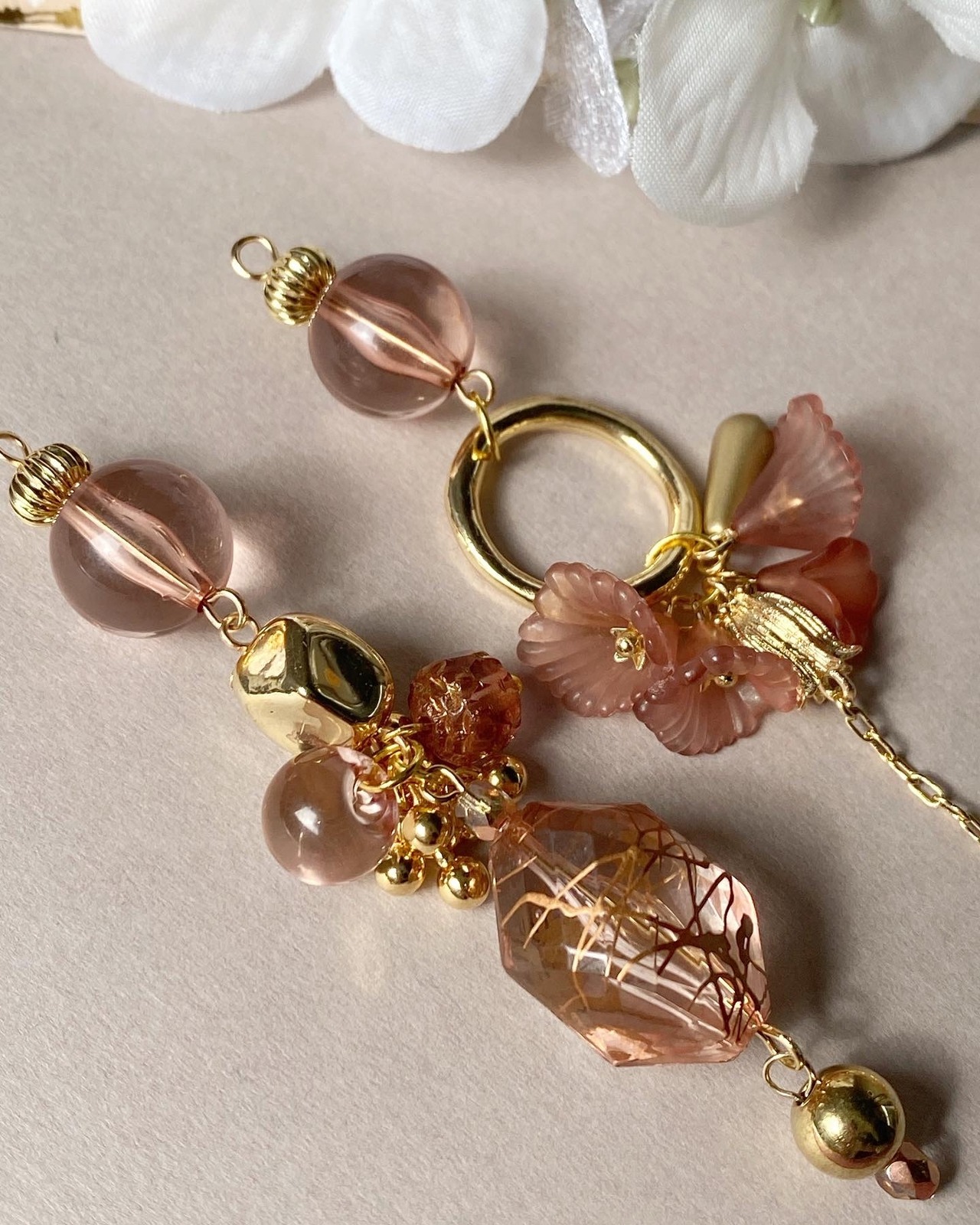 柔らかで華やかなブラウンピンクの色味に映えるゴールド系のパーツを組み合わせているので肌の色にもなじみやすいです。