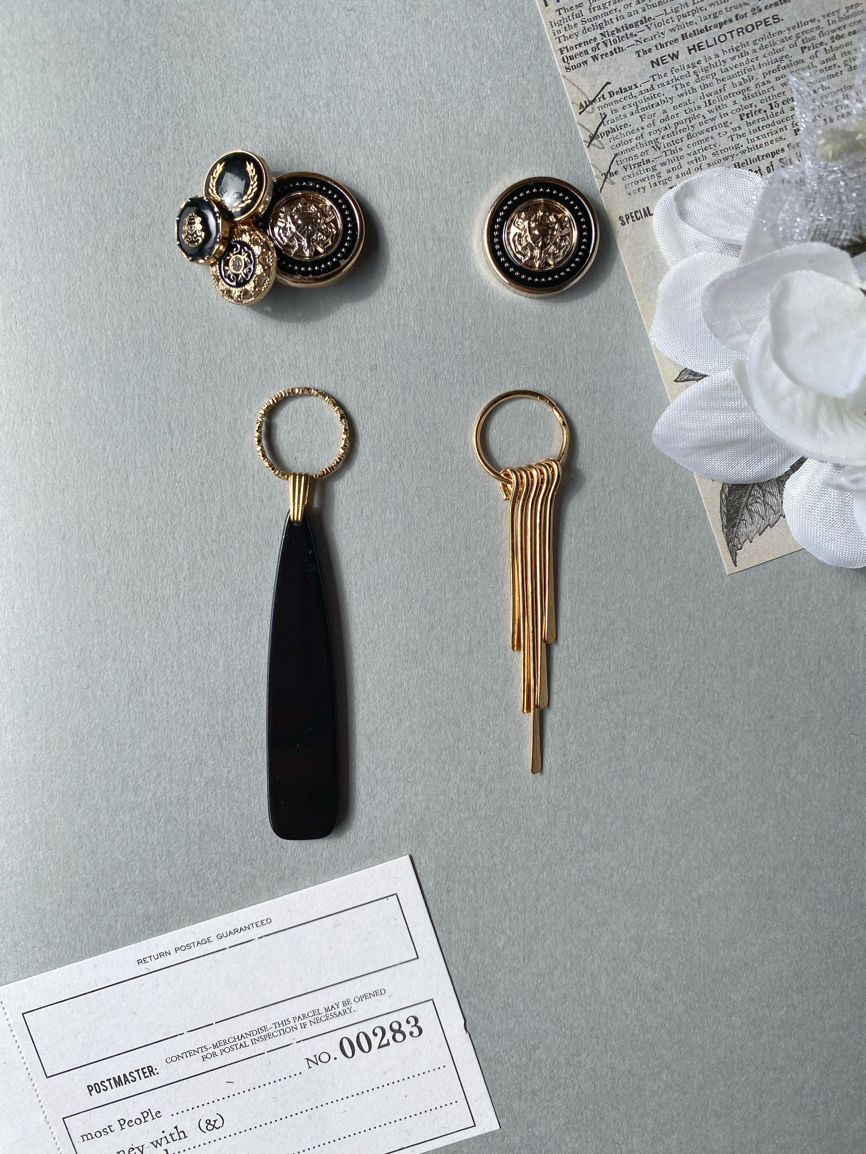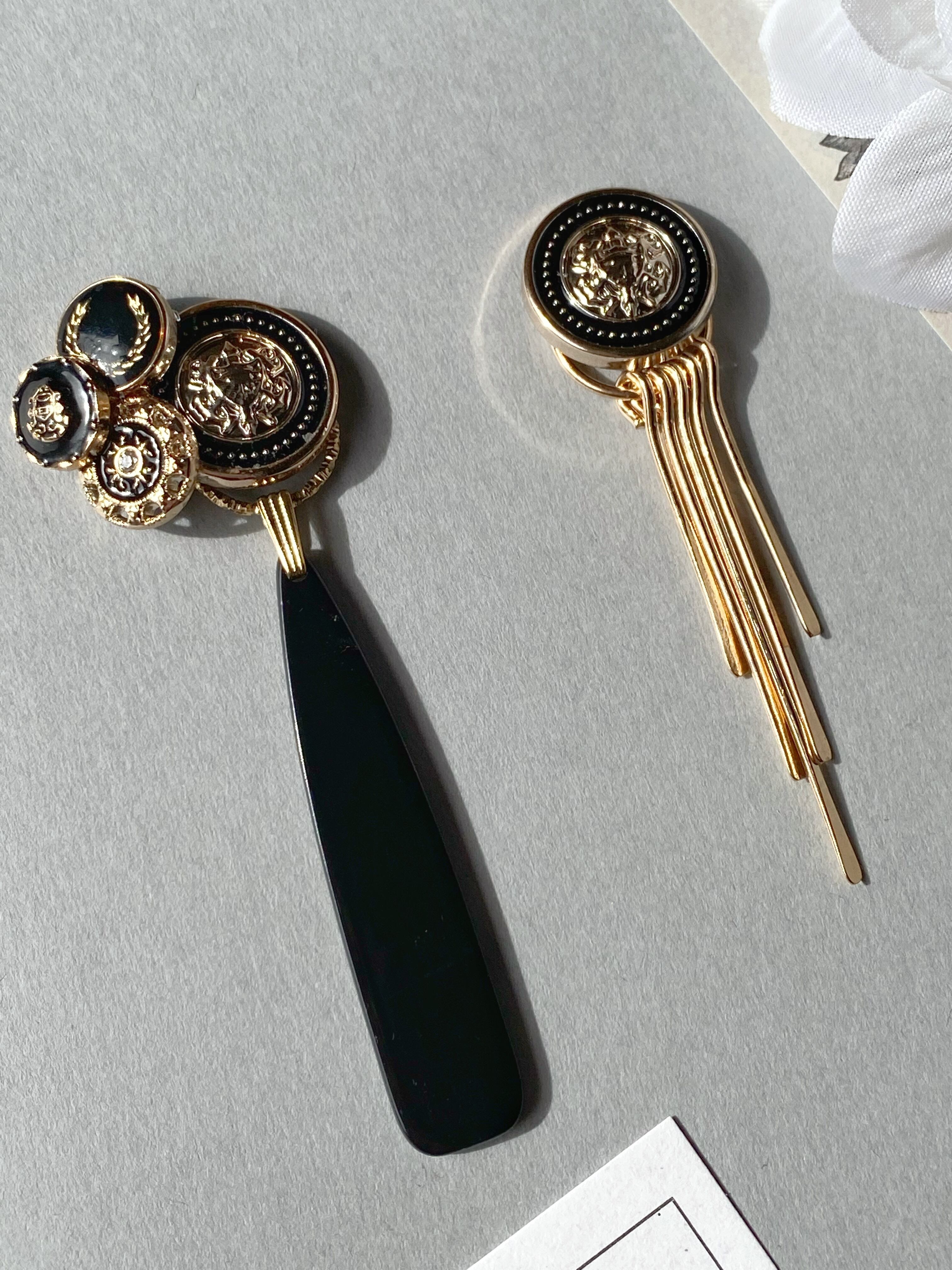ゴールドと黒ベースのボタンとブラックのアクリルパーツやゴールドメタルパーツを使ってピアス・イヤリングを作成しました。
