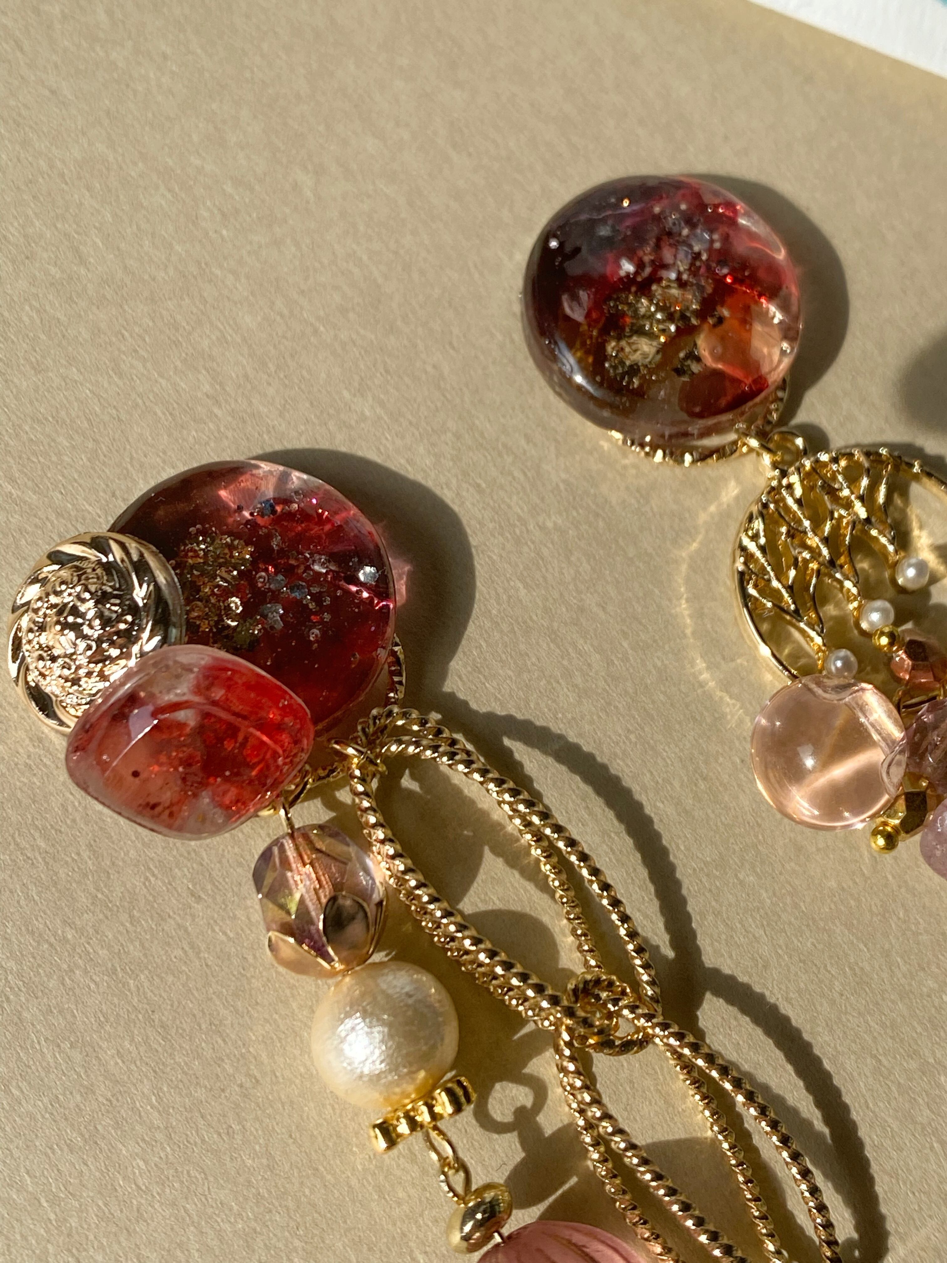 レジンをボタン風に丸く作り、マーブルリキッドでオイルインクアート風に深い赤色のグラデや色の濃淡をだしました。