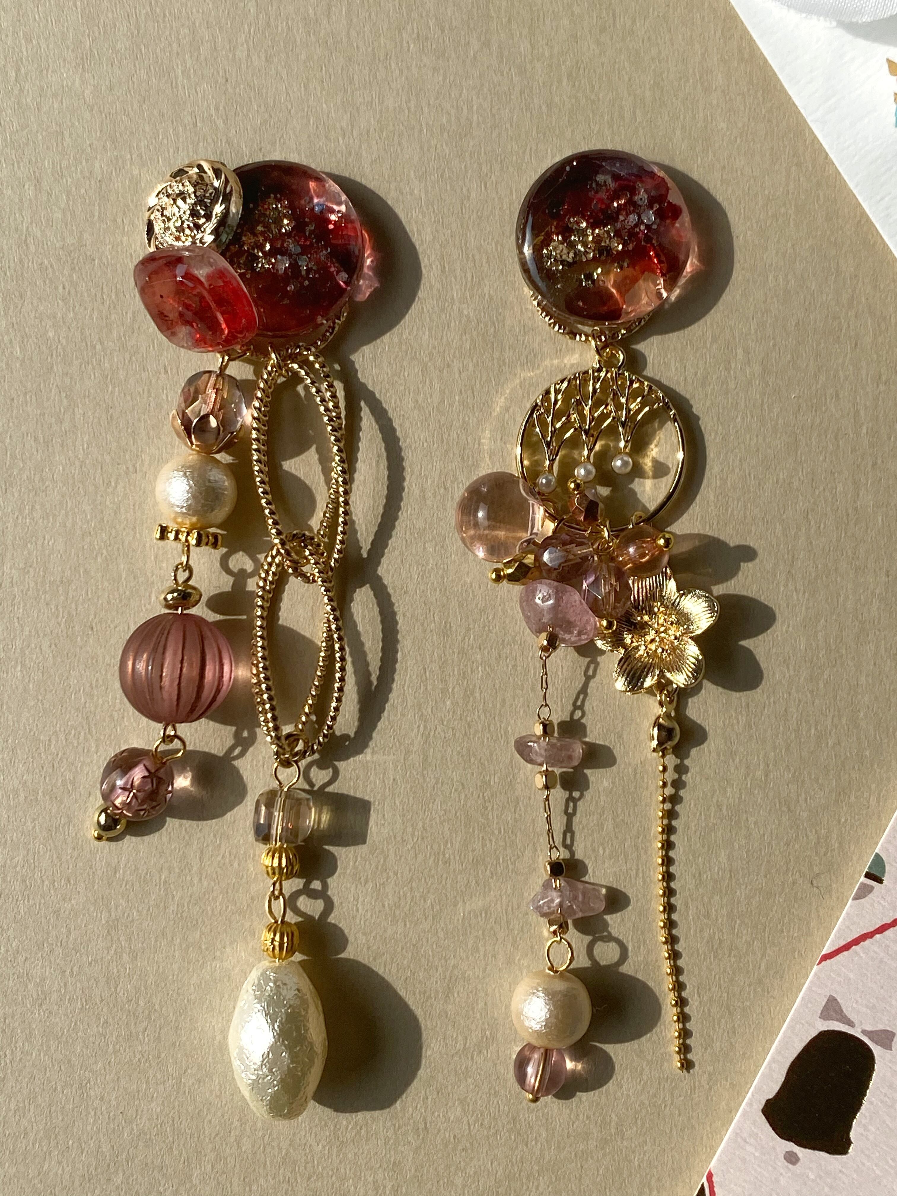 レジンでつくったボタン型トップにマーブルリキッドを使ってバーガンディー色のオイルインクアート風に着色したアシンメトリーピアス・イヤリングです。