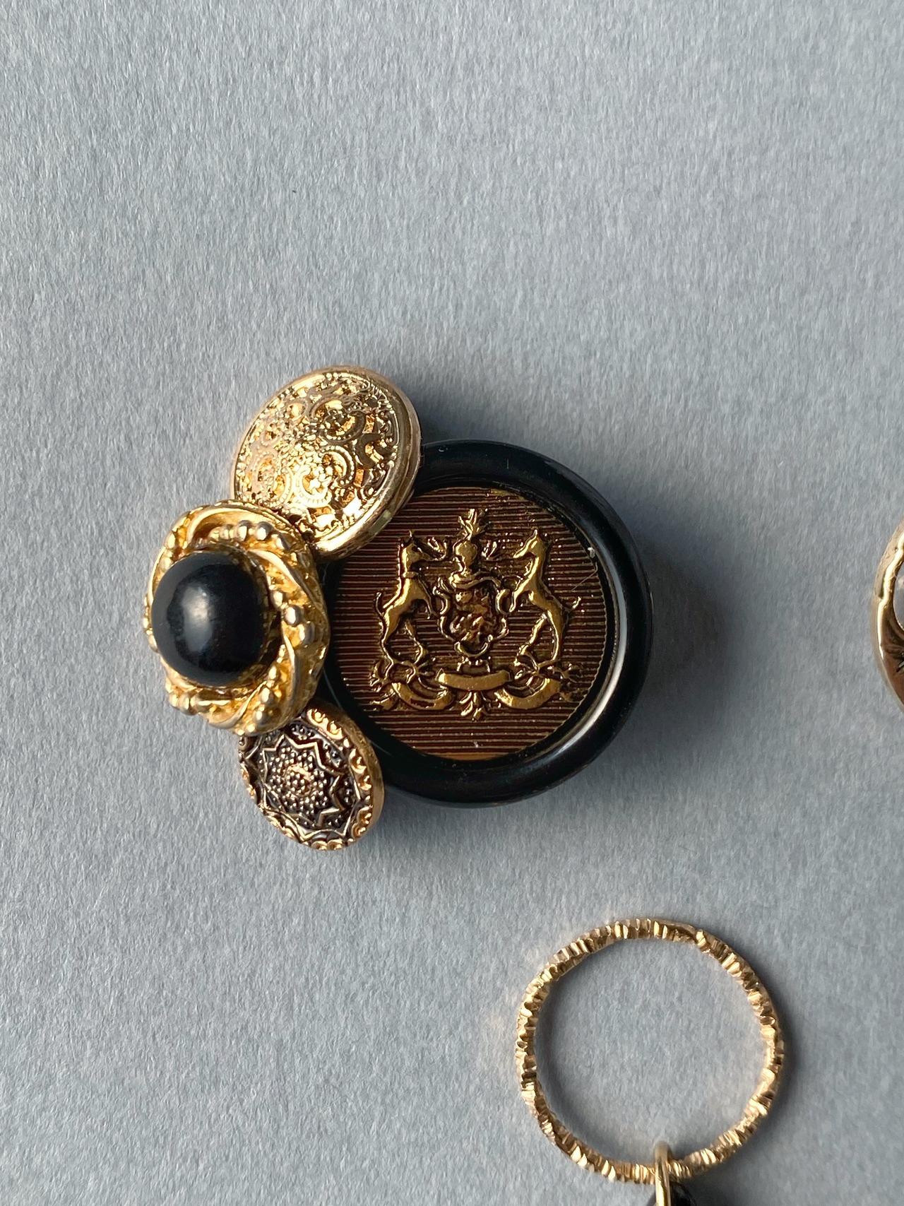黒ベースのボタンとブラックのアクリルパーツやゴールドのアクリルパーツを使ってピアス・イヤリングを作成しました。