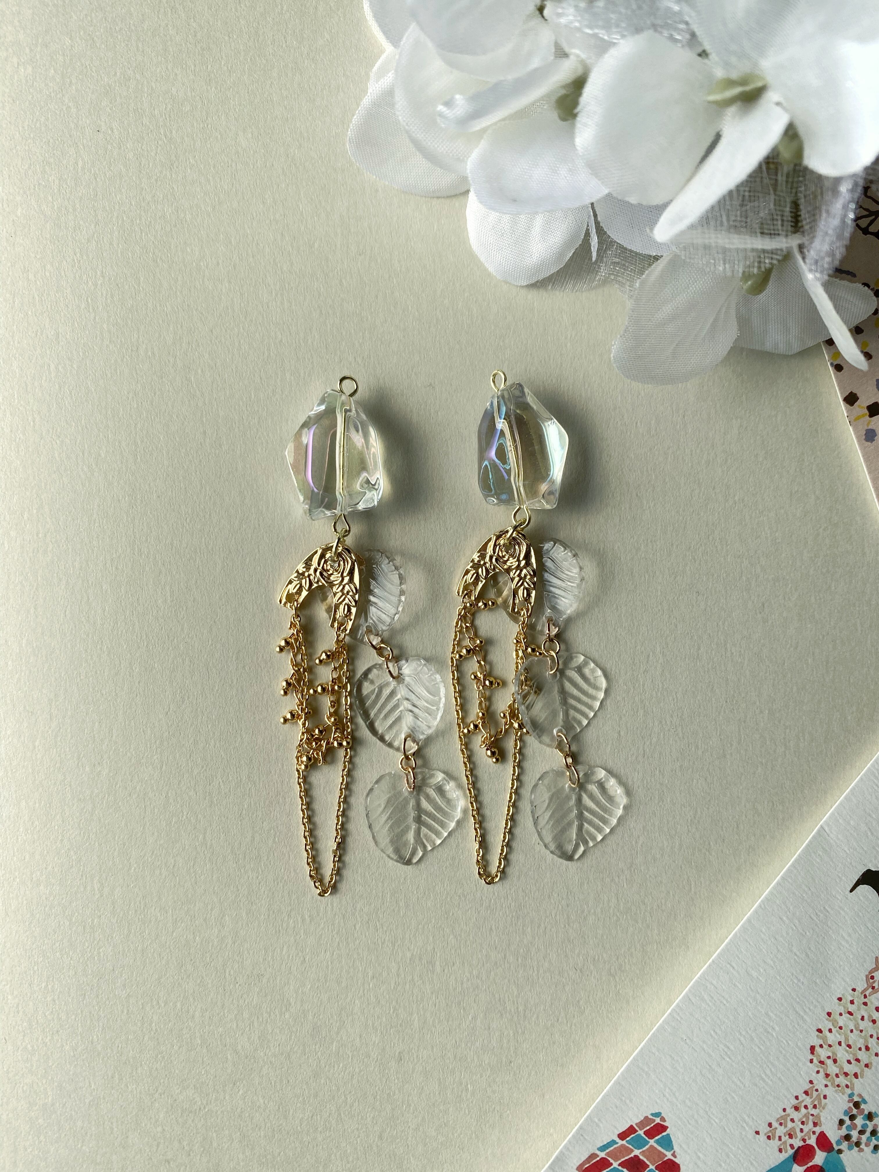 氷のような多角形のカットが入ったオーロラカラーのビーズにゴールドのチェーンや同じくクリアカラーのアクリル素材のリーフパーツを3連でつなげました。