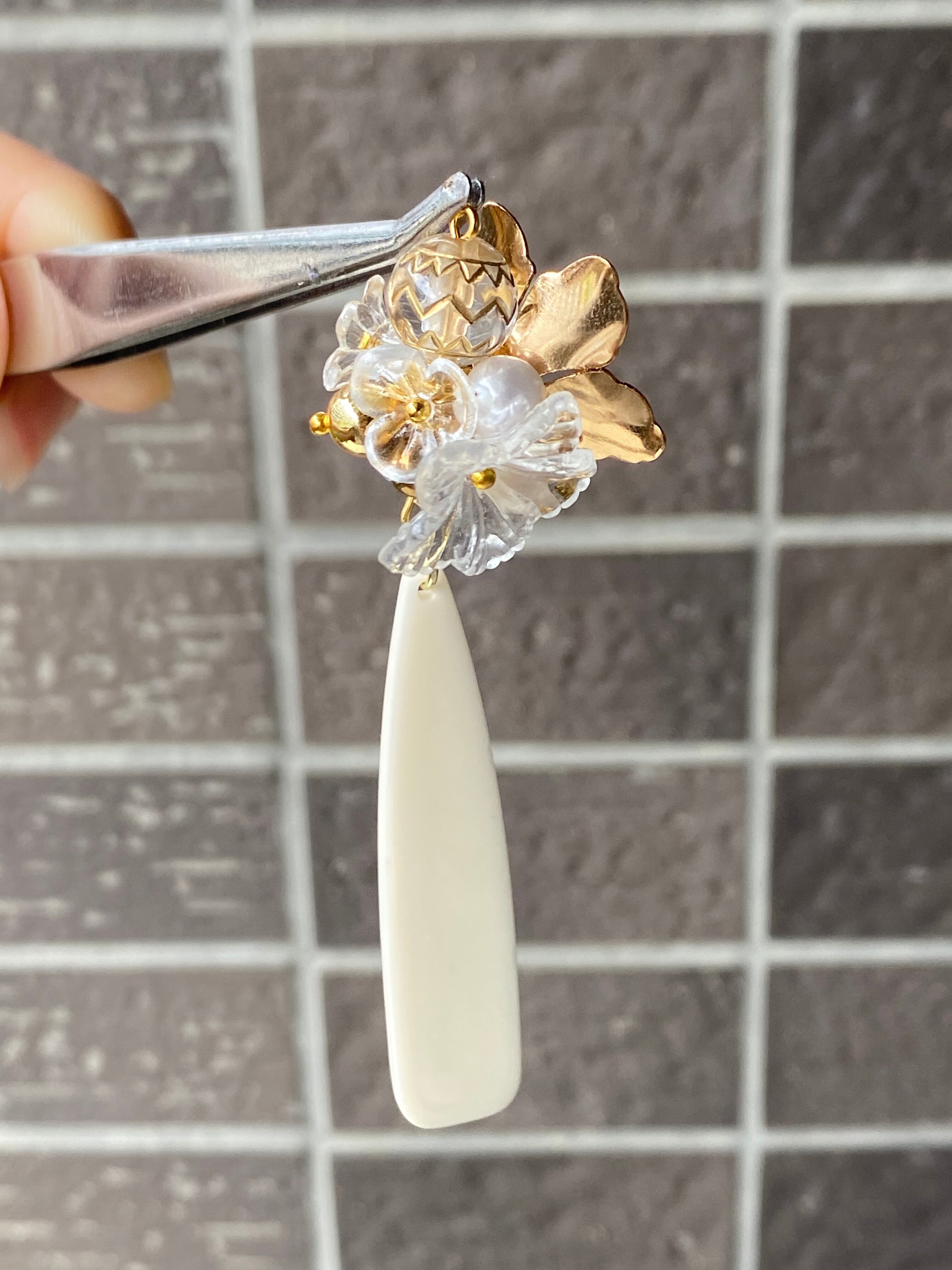 クリアカラーのアクリルパーツをビーズやフラワーパーツでブーケのように組み合わせ、コットンパールやホワイトカラーのスティックプレートなどと組み合わせたアクセサリーです。