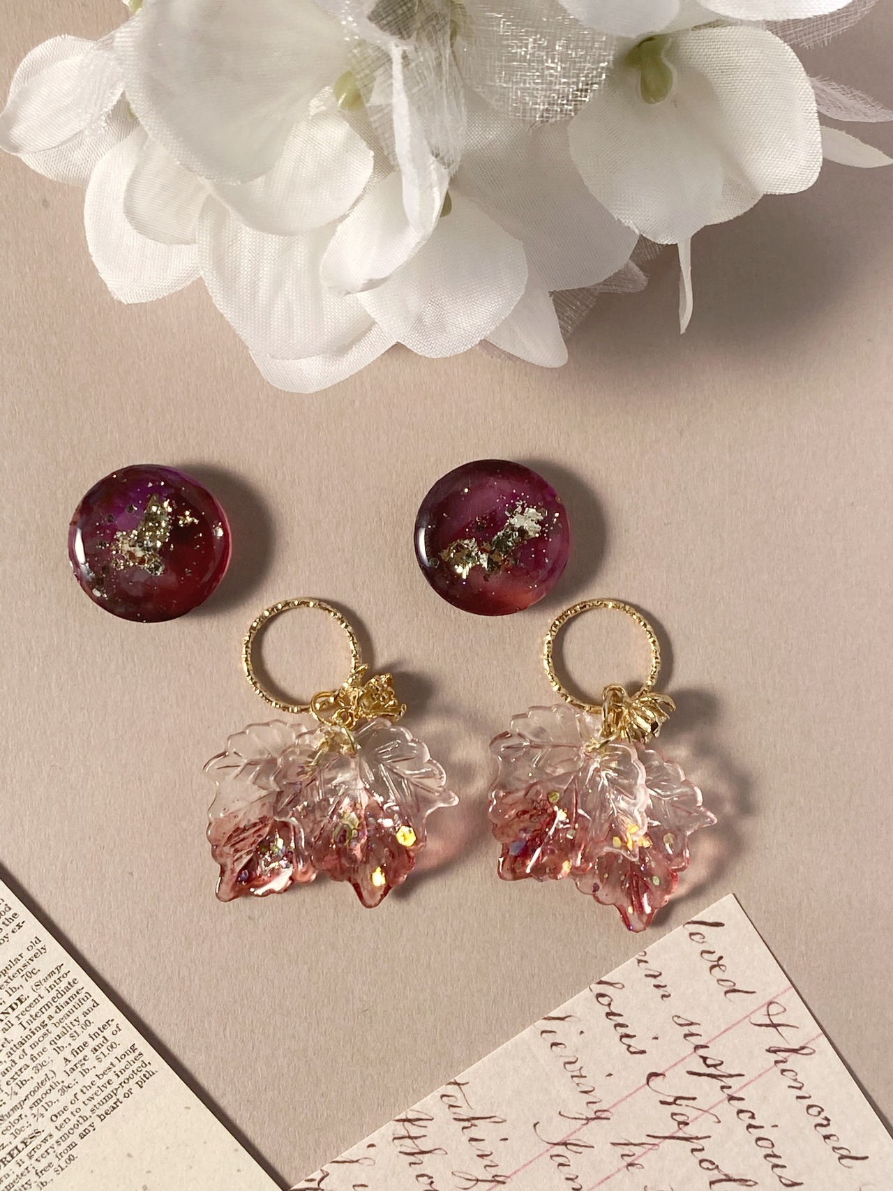 ワインレッドで着色し、ラメや金箔を閉じ込めたカボションをメインにし、葡萄の葉のようなモチーフの先にもワイン色で着色した大人可愛いピアス・イヤリングです。