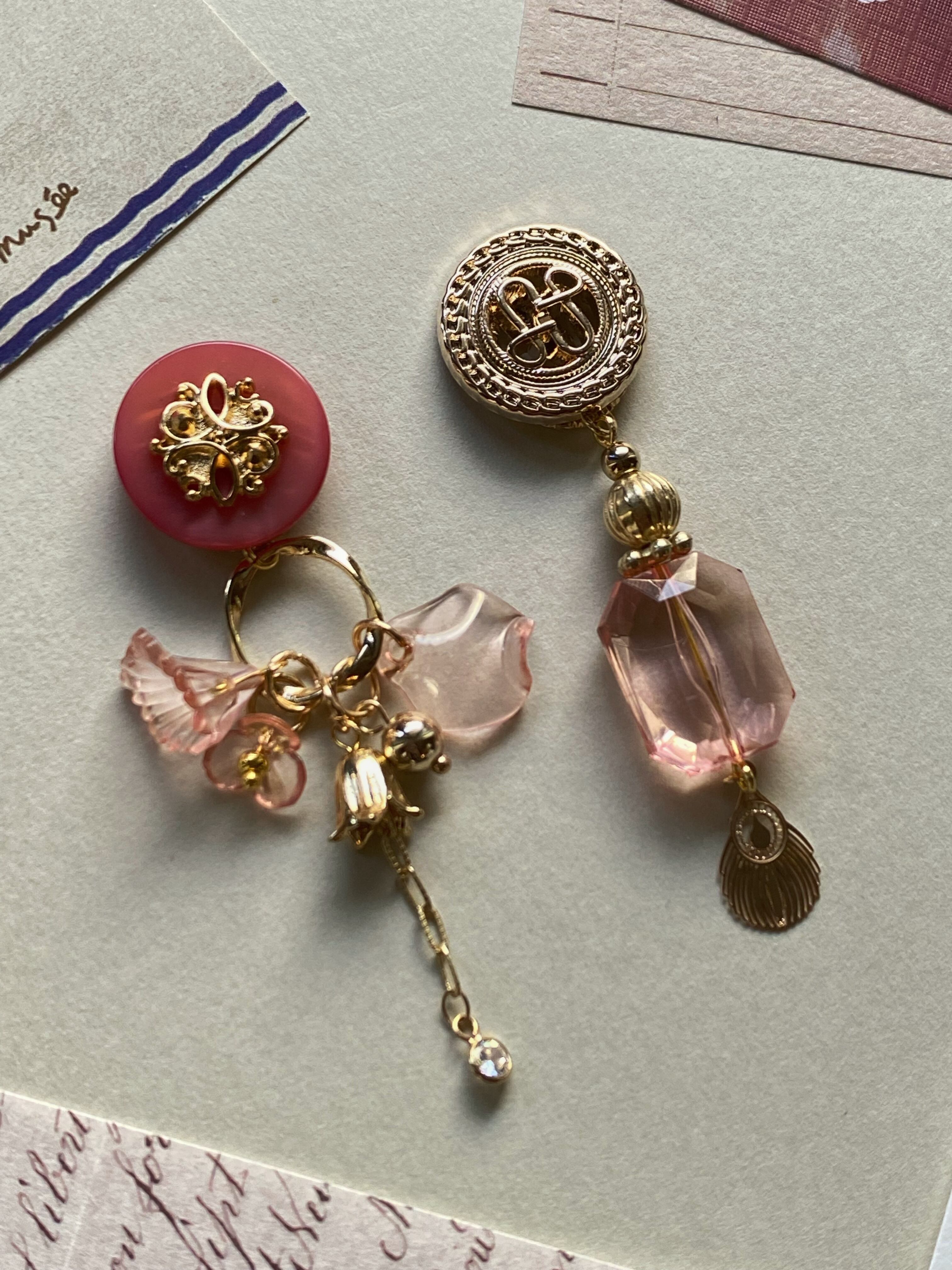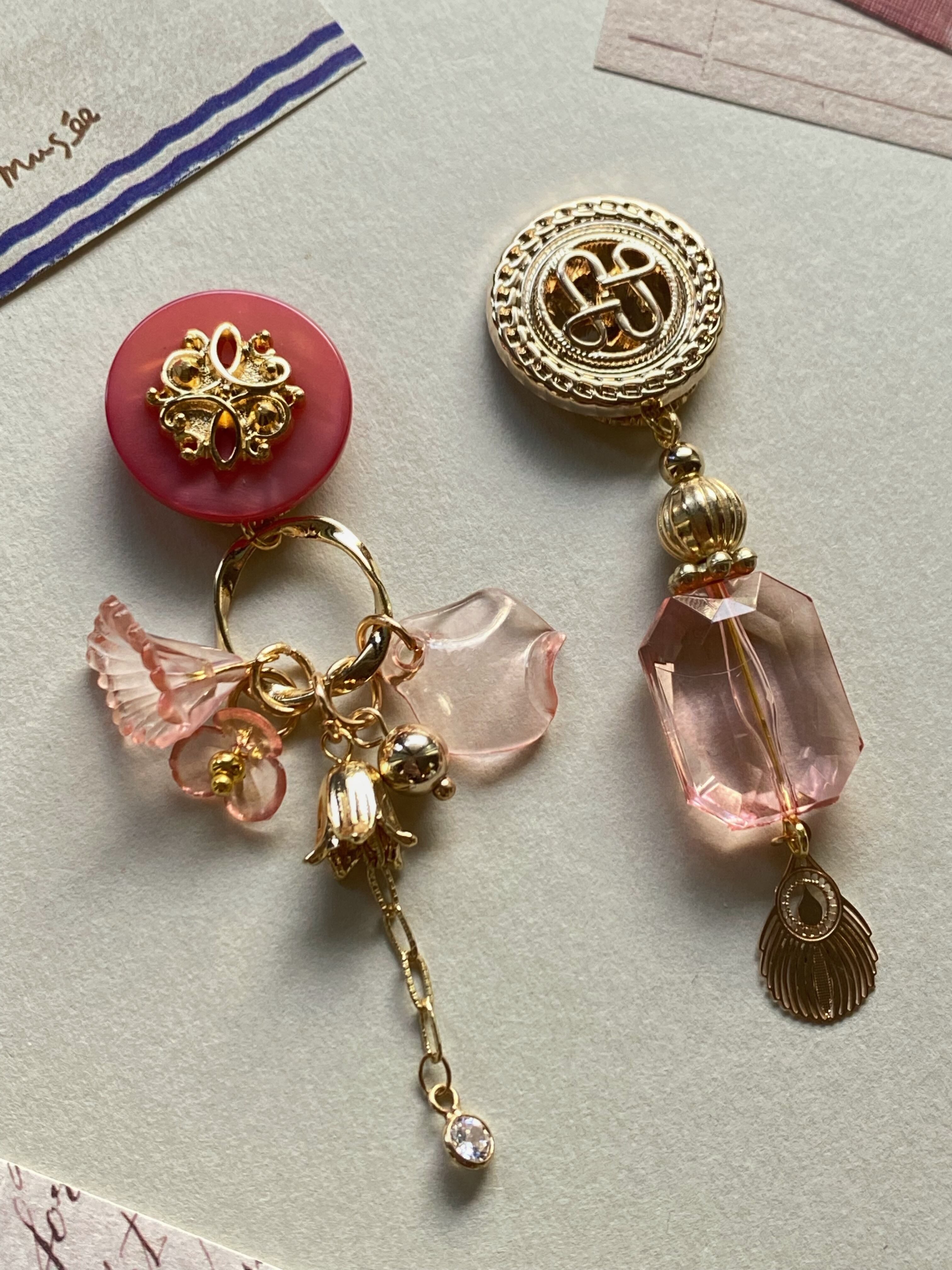 赤いボタンピアスをポイントに、ピンクカラーに手染めしたビーズやアクリルパーツとゴールド系パーツを組み合わせて作ったアクセサリーです。