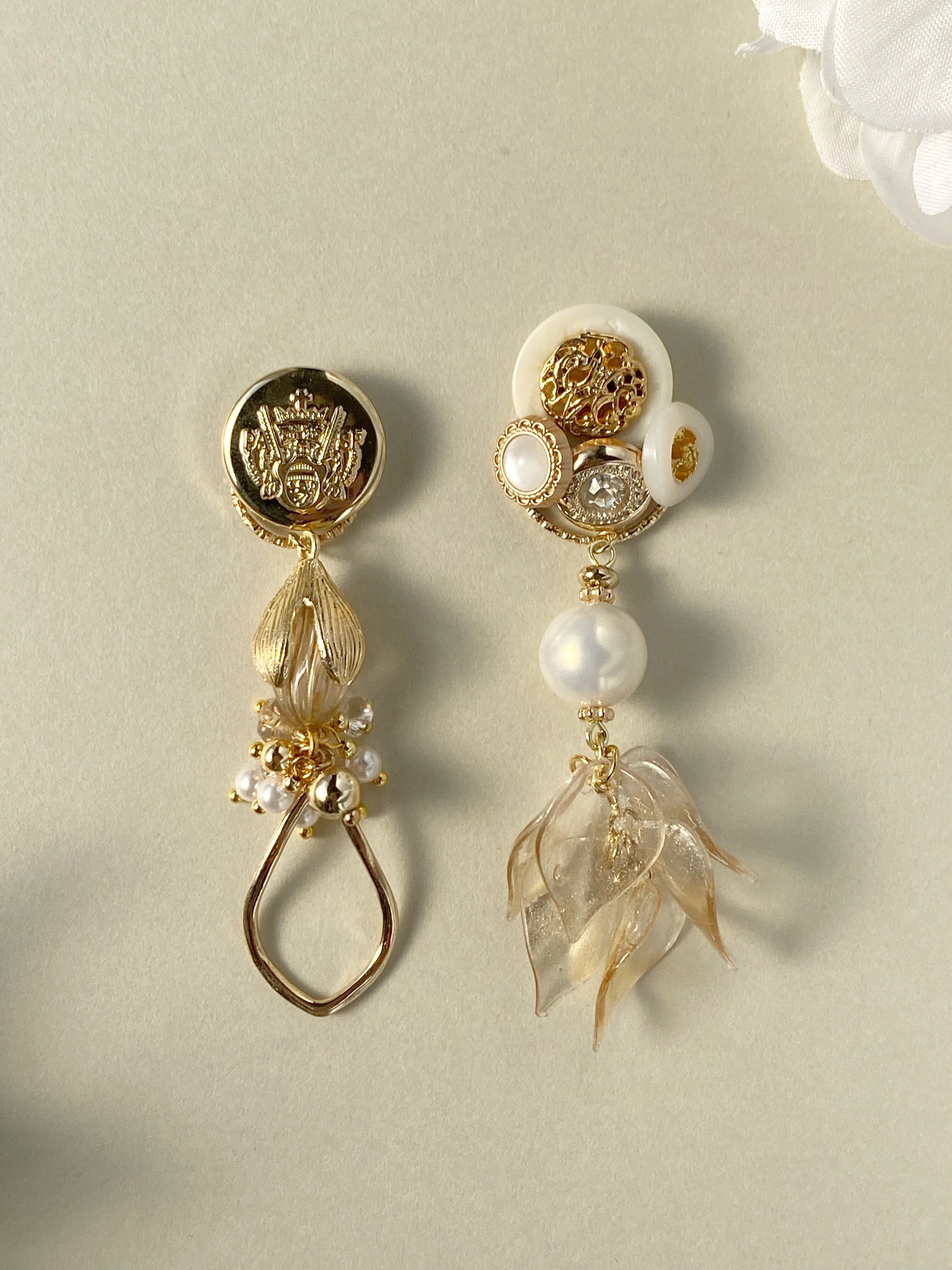 白を貴重としたボタンとゴールド系のパーツを組み合わせたピアス・イヤリングです。