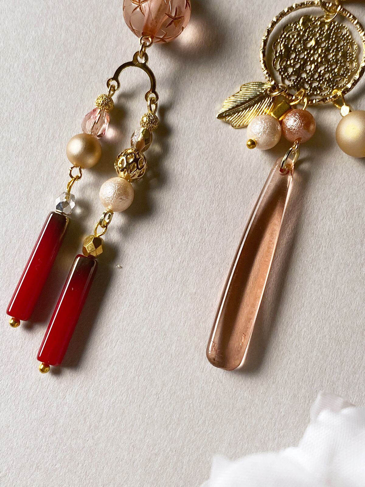 チャームには手染めのビーズやコットンパールやゴールドカラーのビーズを組み合わせました。