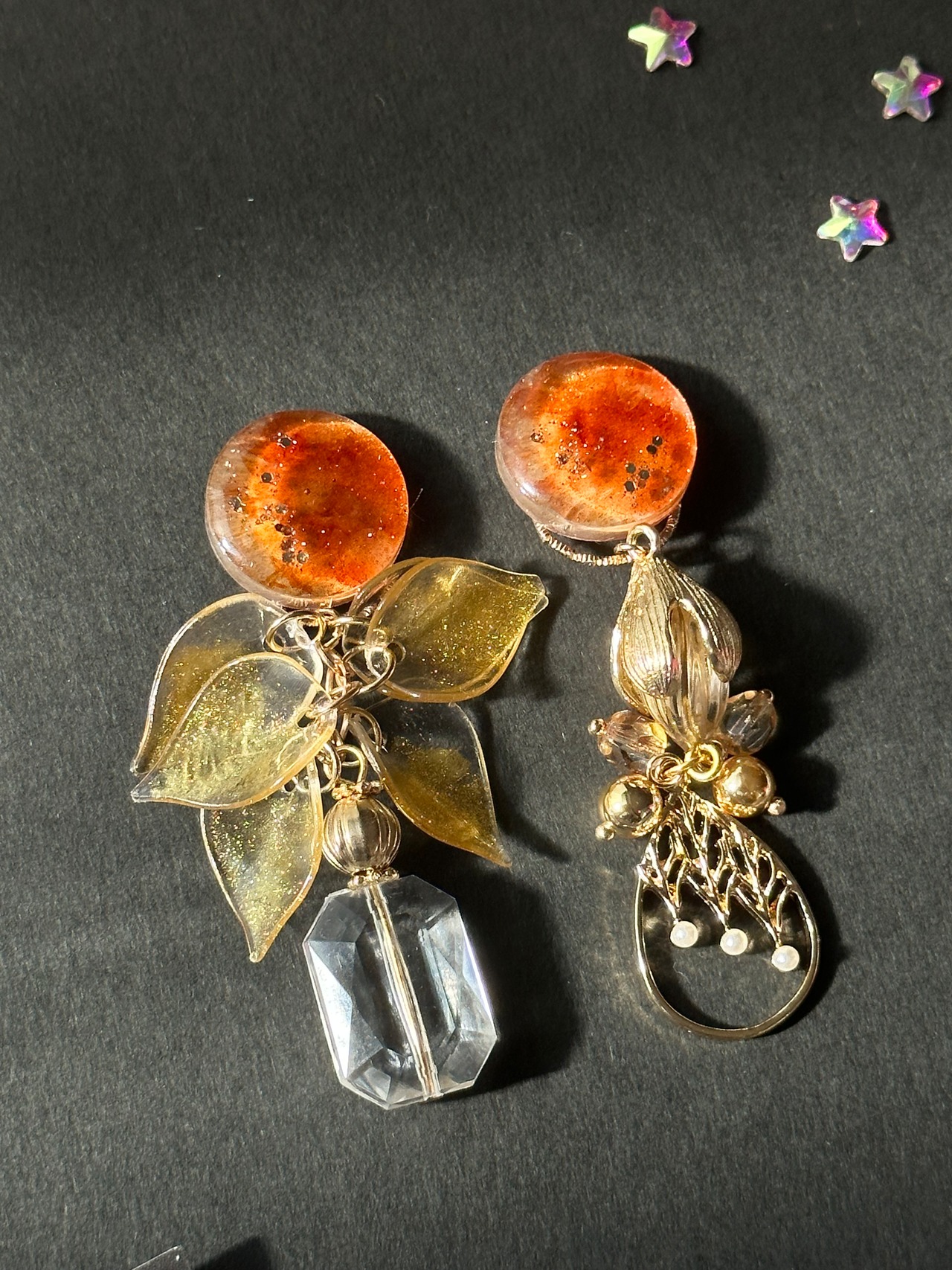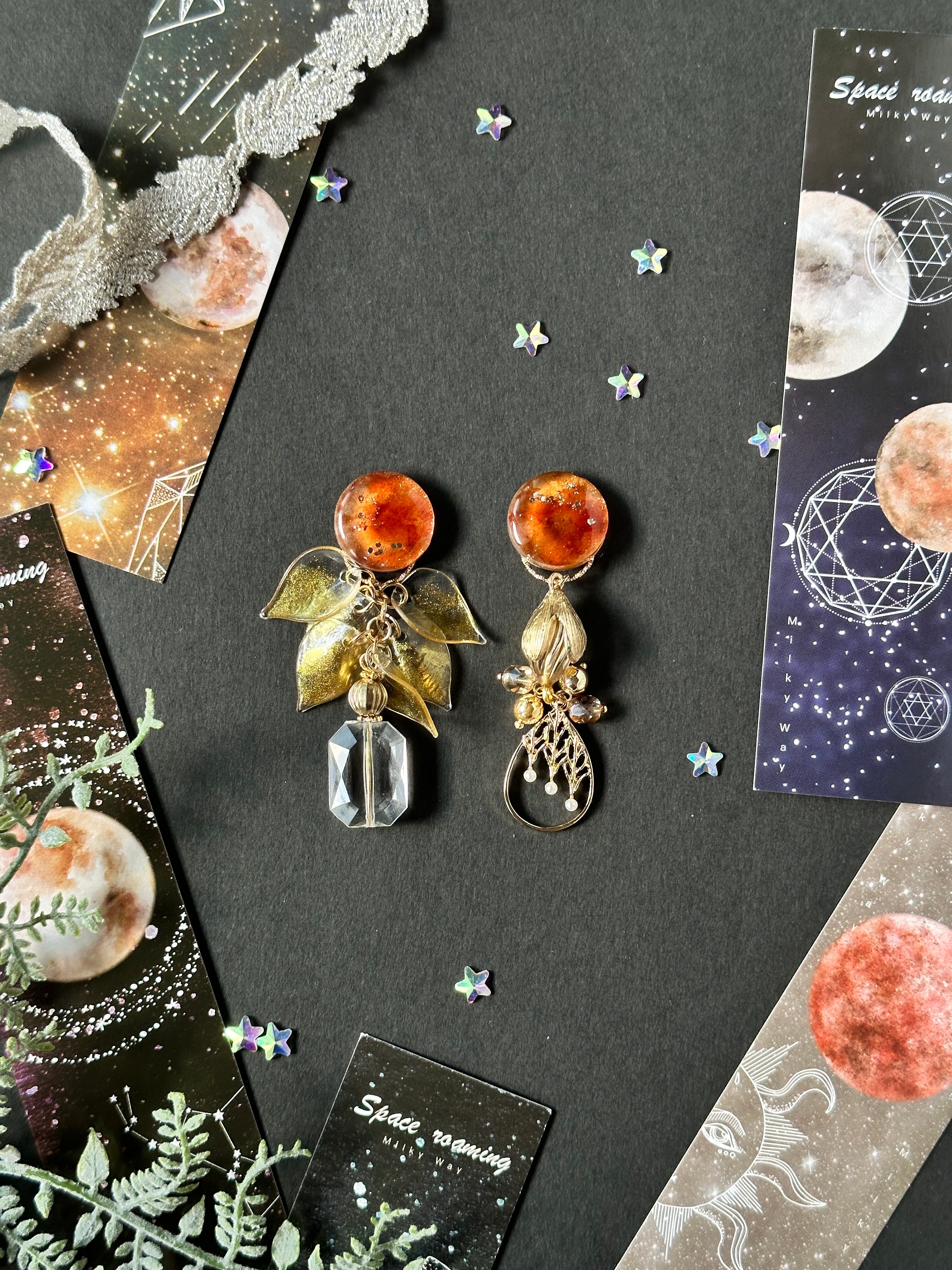 レジンでつくった火星を模したカボションに星モチーフのチャームをつけたピアス・イヤリングです
