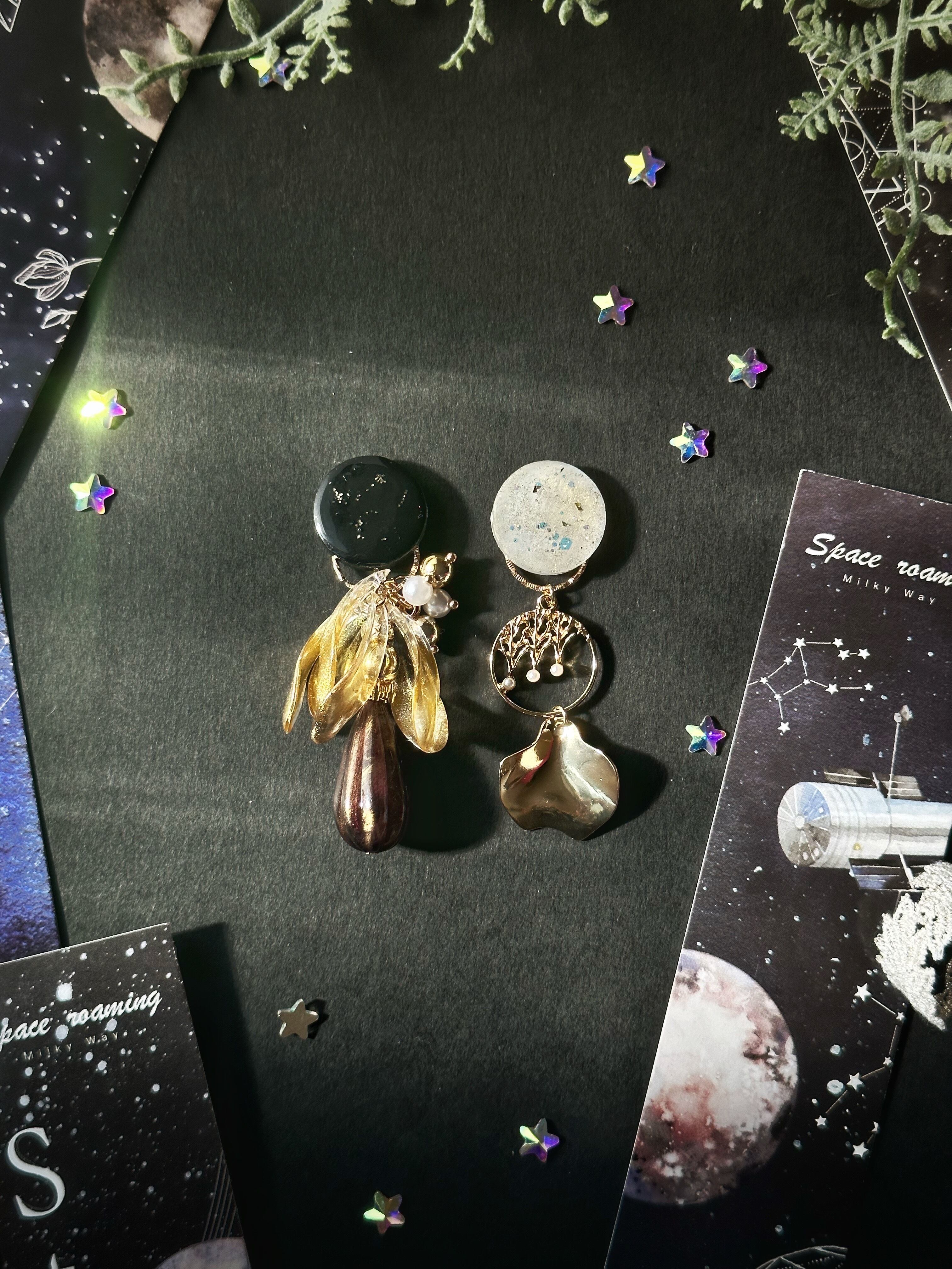 レジンでつくった星空と月を模したカボションにチャームをつけたピアス・イヤリングです