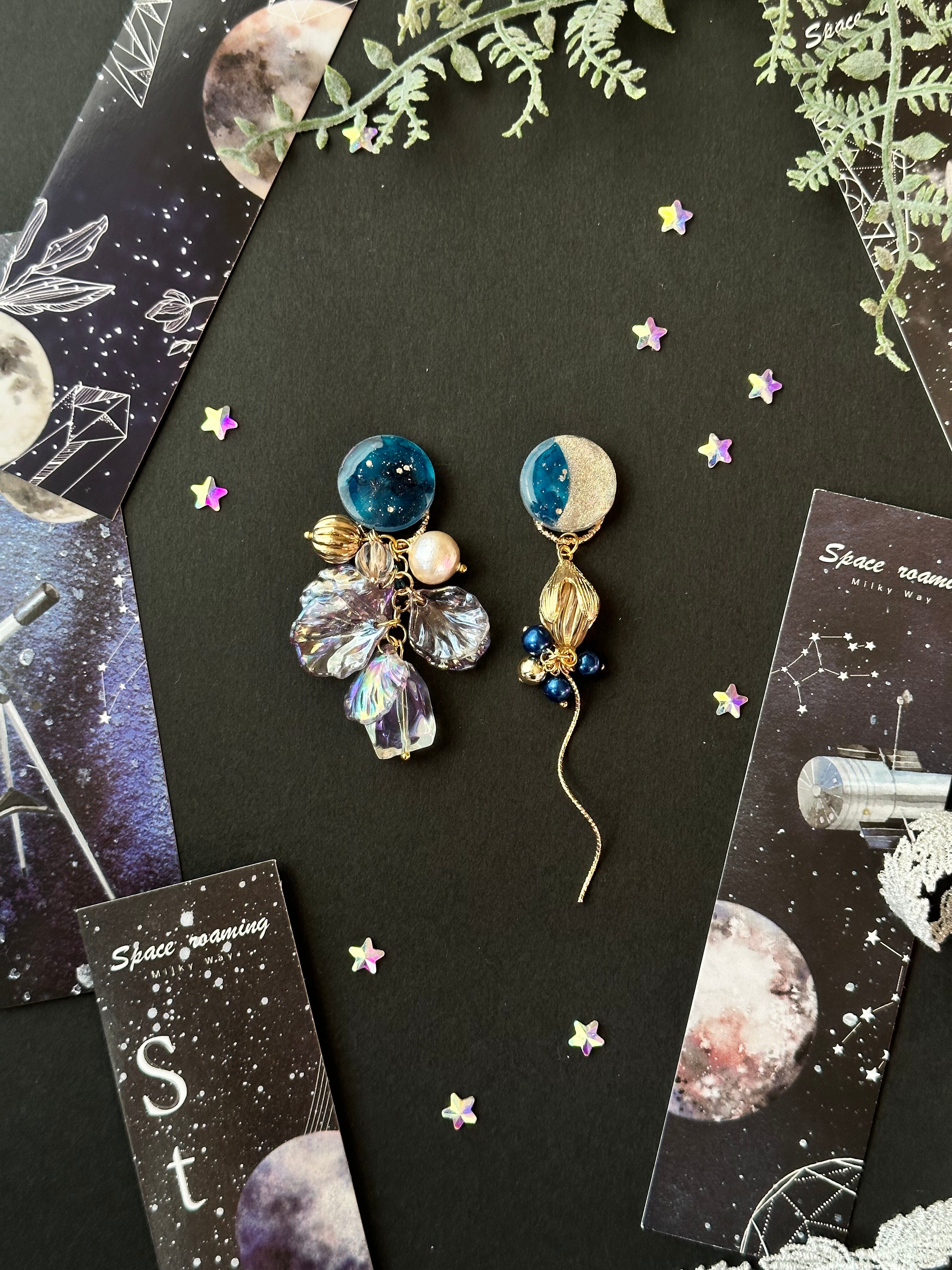 レジンでつくった星空と月を模したカボションにチャームをつけたピアス・イヤリングです
