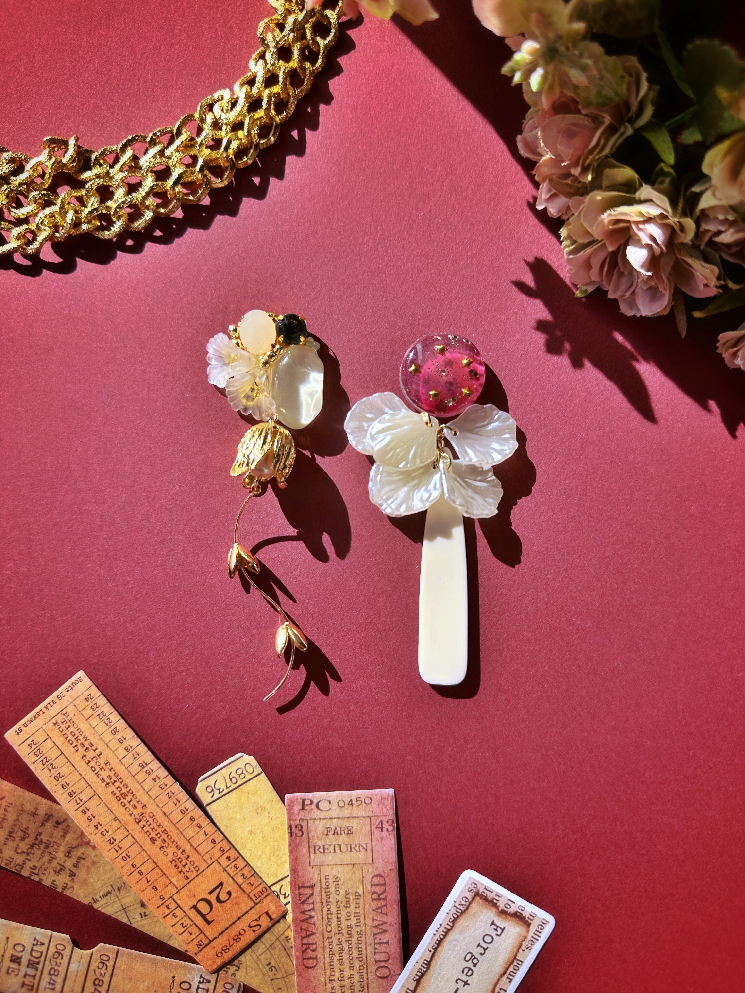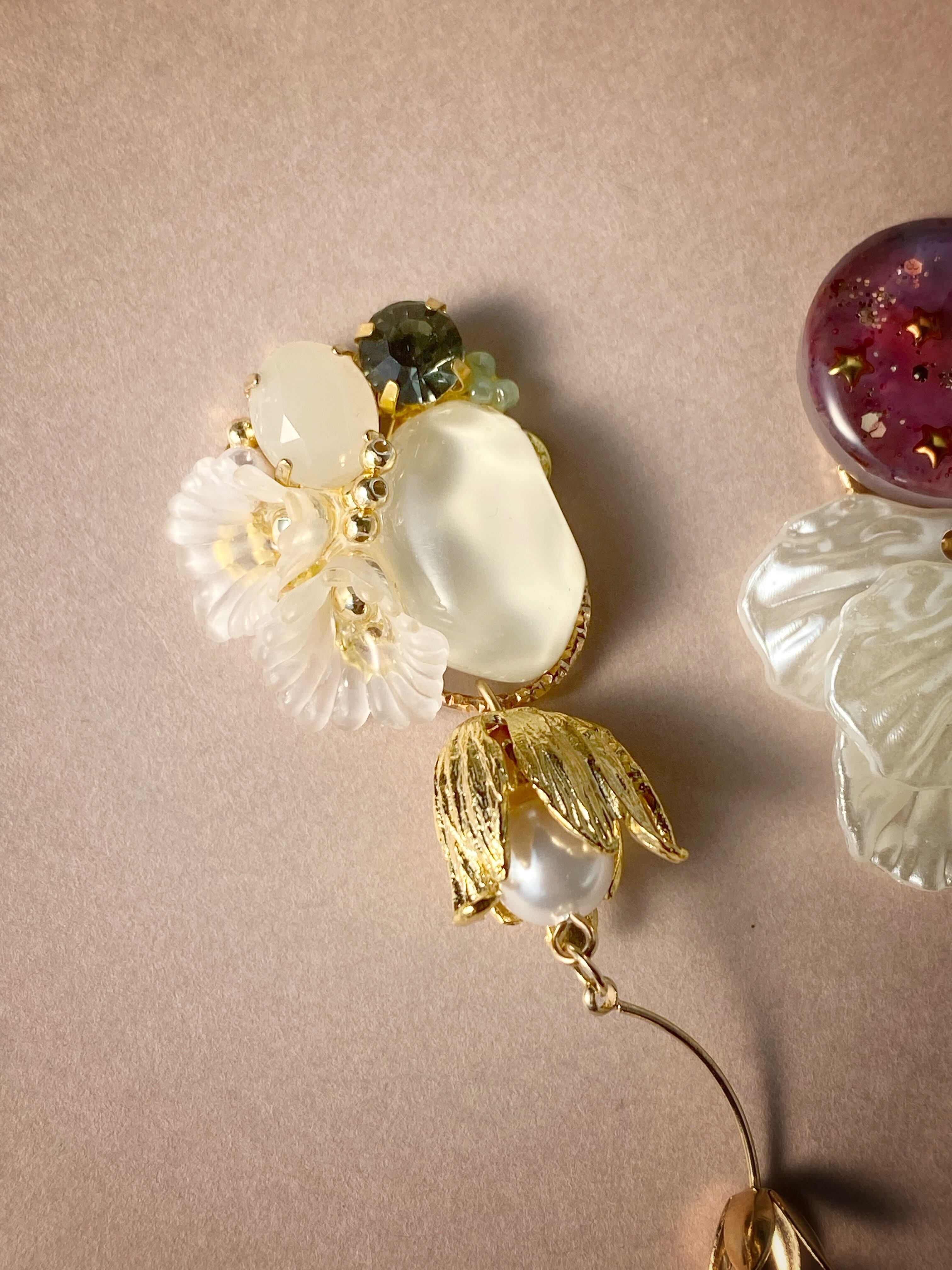 さらに、右のチャームもマルグリットの純白な姿を写し取り、白い花びらやプレートで構成し、カボションには彼女の後ろに瞬く星を描きました。