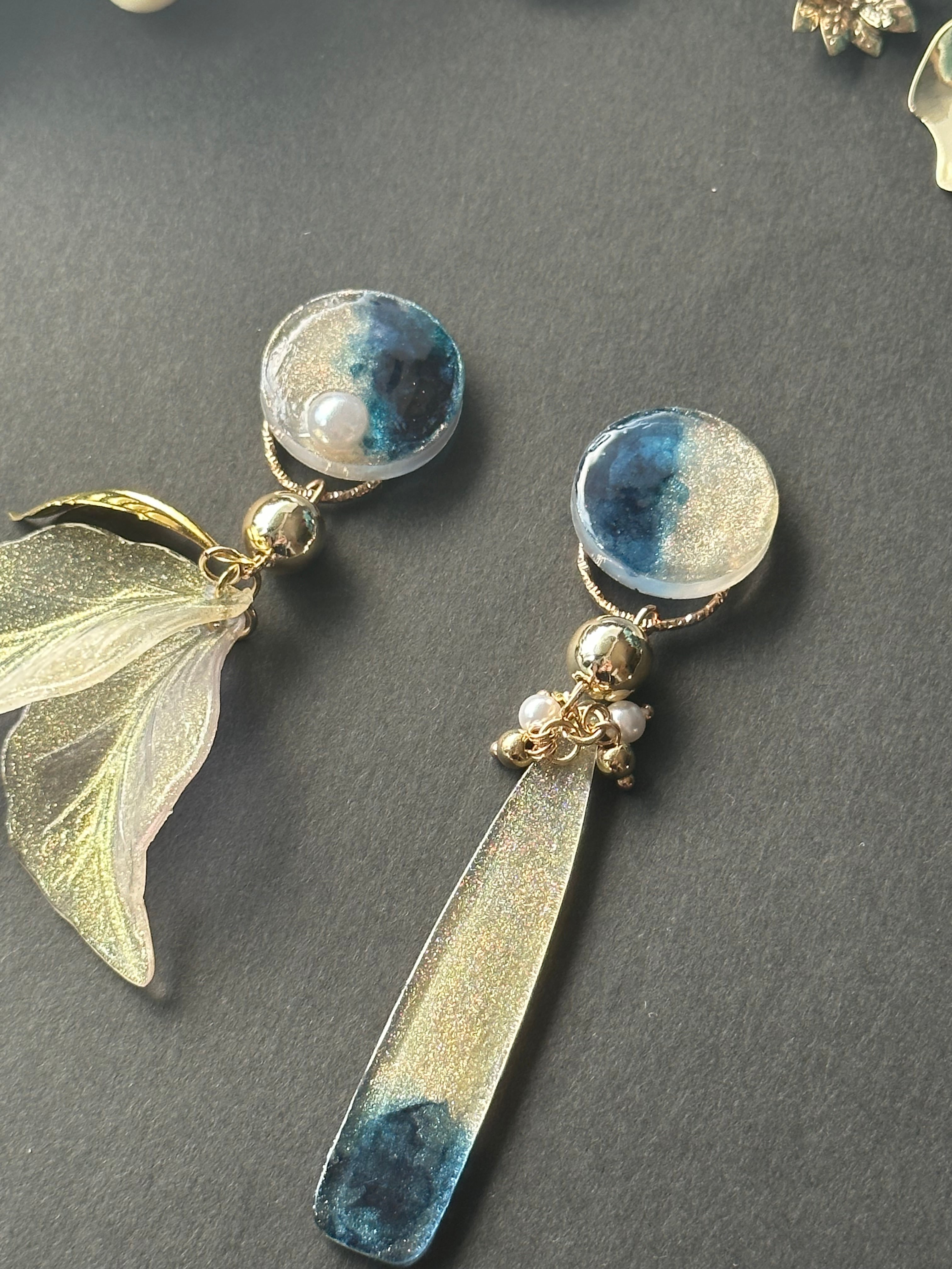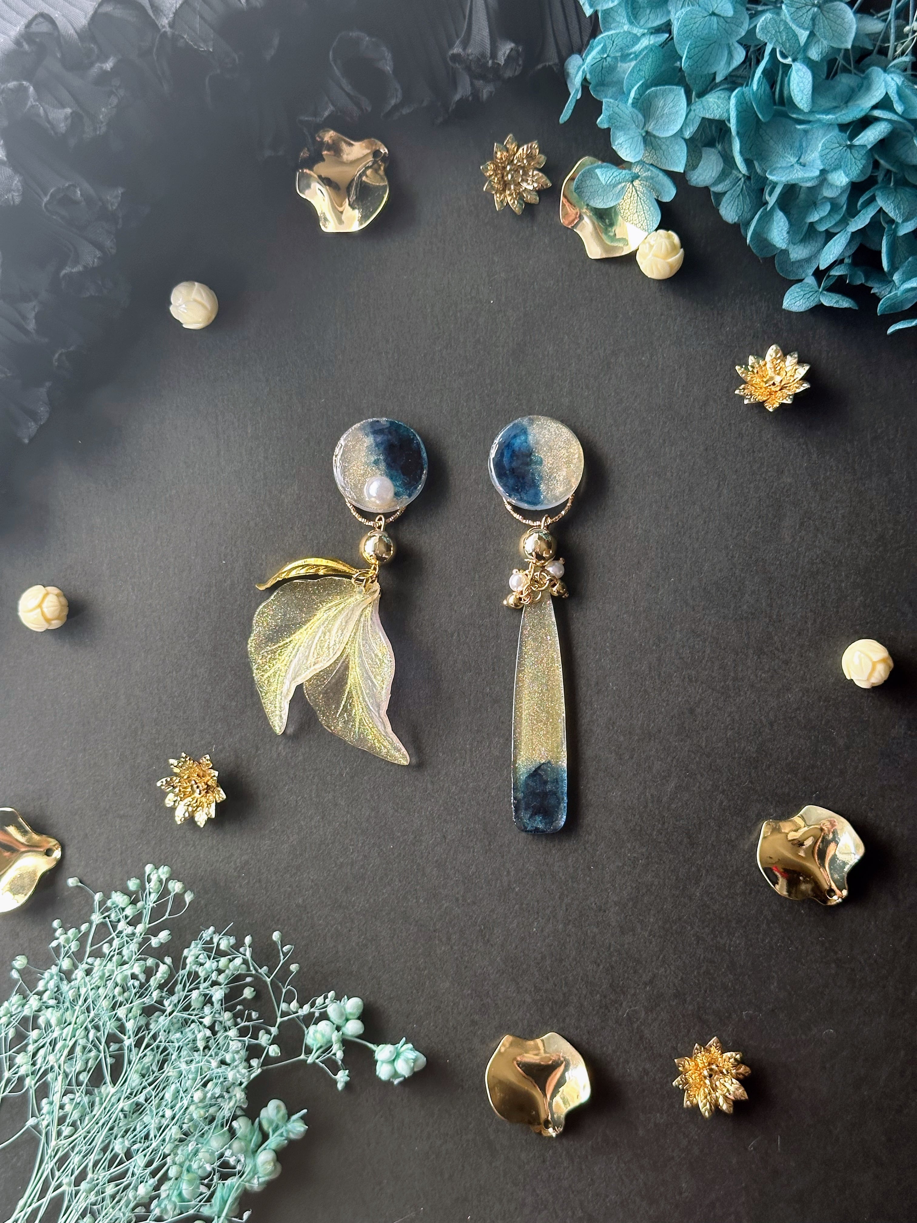 フェルメールの代表作、「真珠の耳飾りの少女」をモチーフにレジンを青と金で着色し、リーフなどのチャームを付け加え