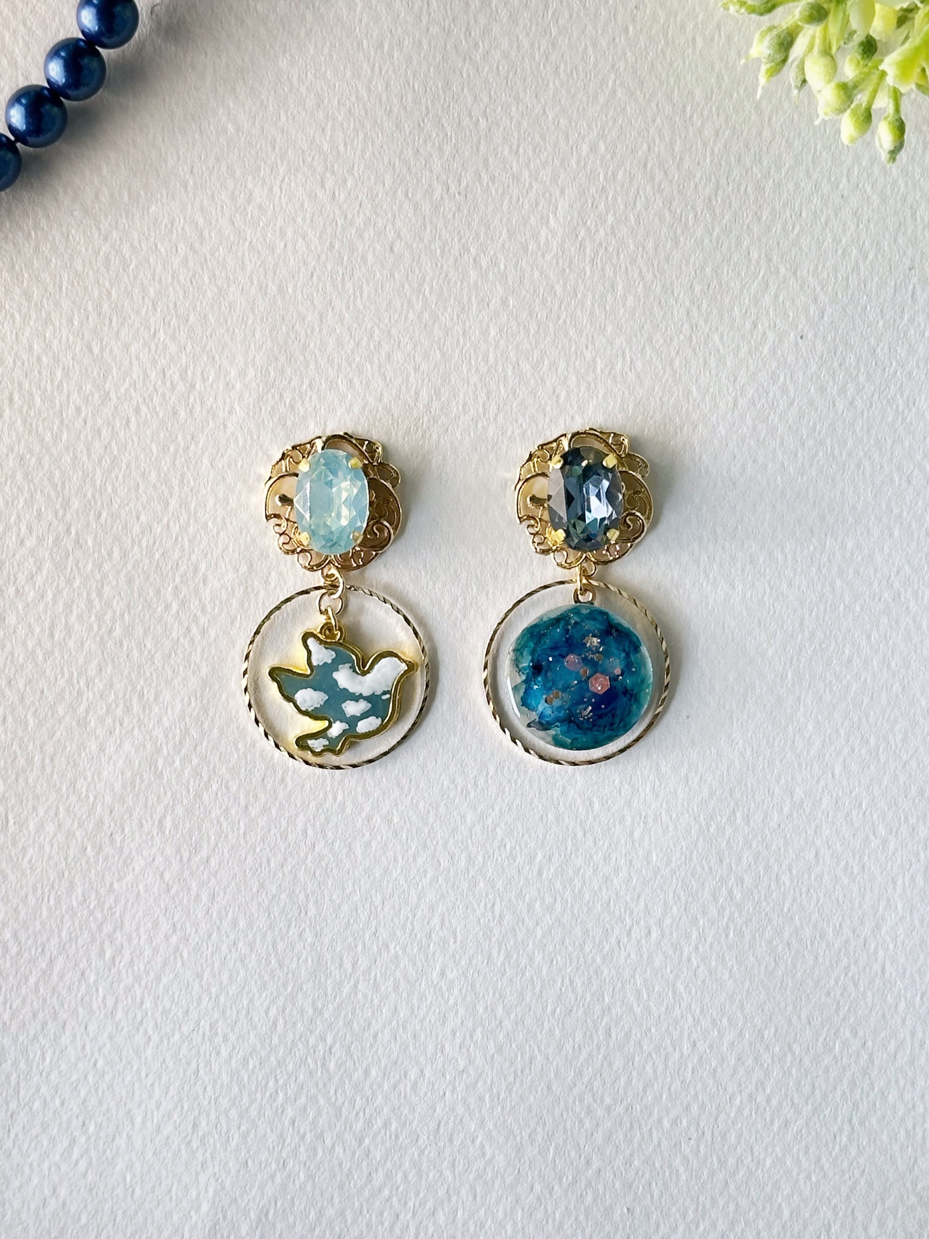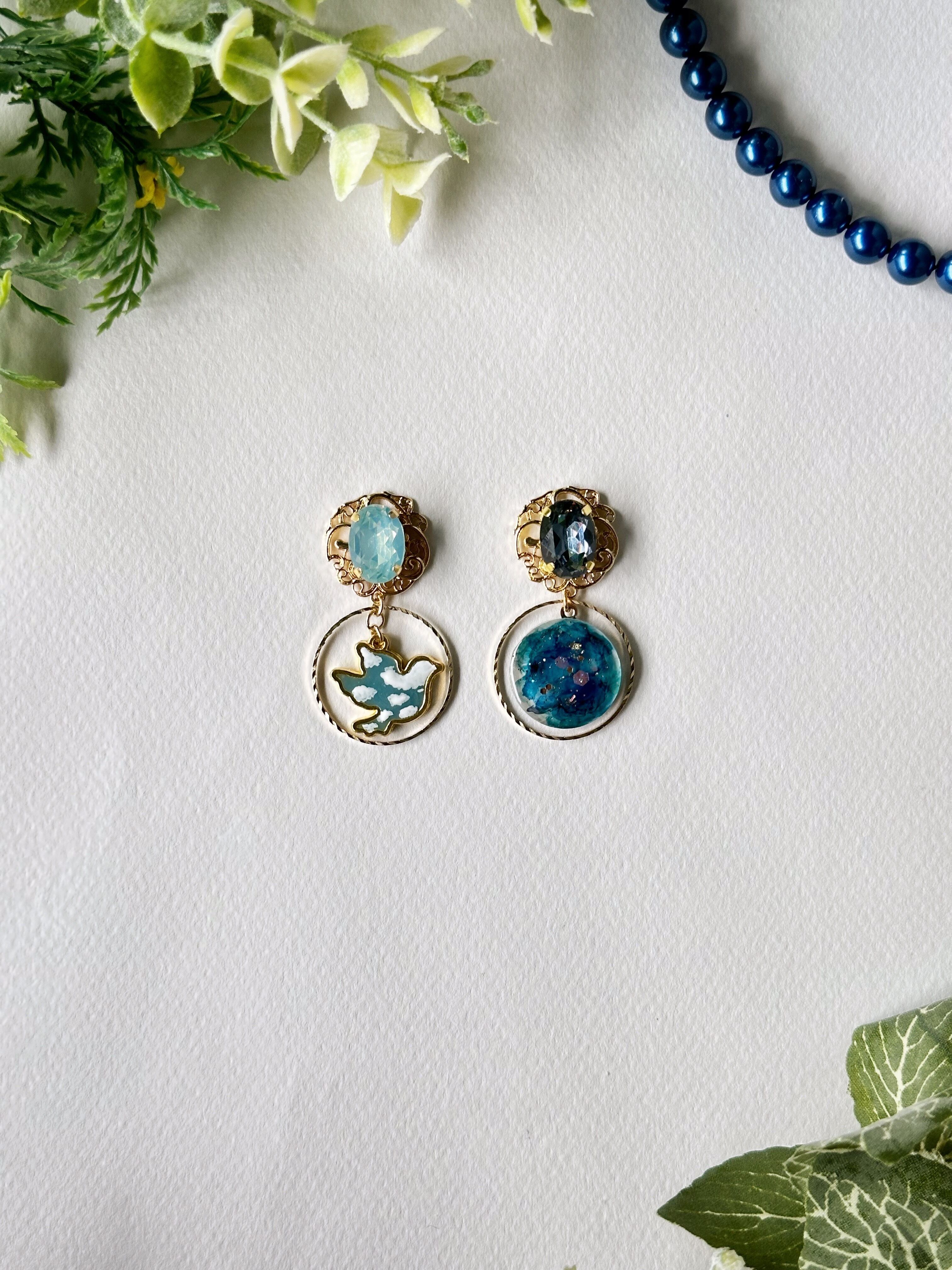 この作品の象徴的なモチーフ青空と雲のシルエットの鳥をチャームにし、他のパーツと違和感のないように組み合わせています。