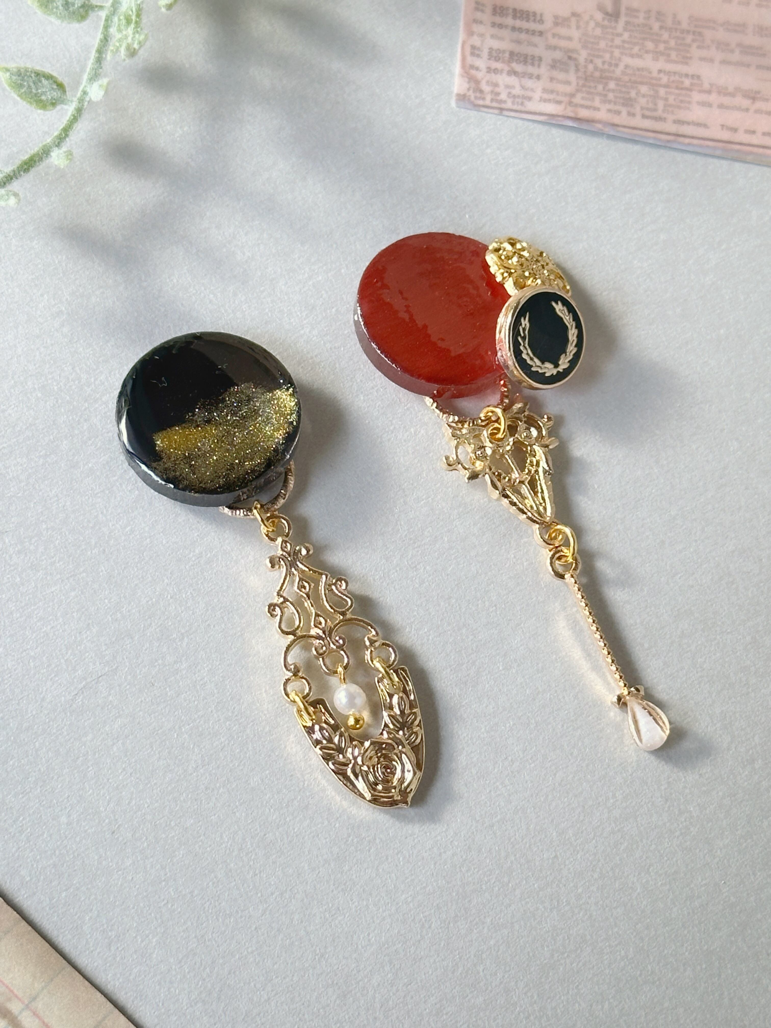 今回はこの黒、赤、金、白の主張をアクセサリーに取り込み、その色味の構成を強調させるためにチャームやカボション自体はシンプルに形作りました。