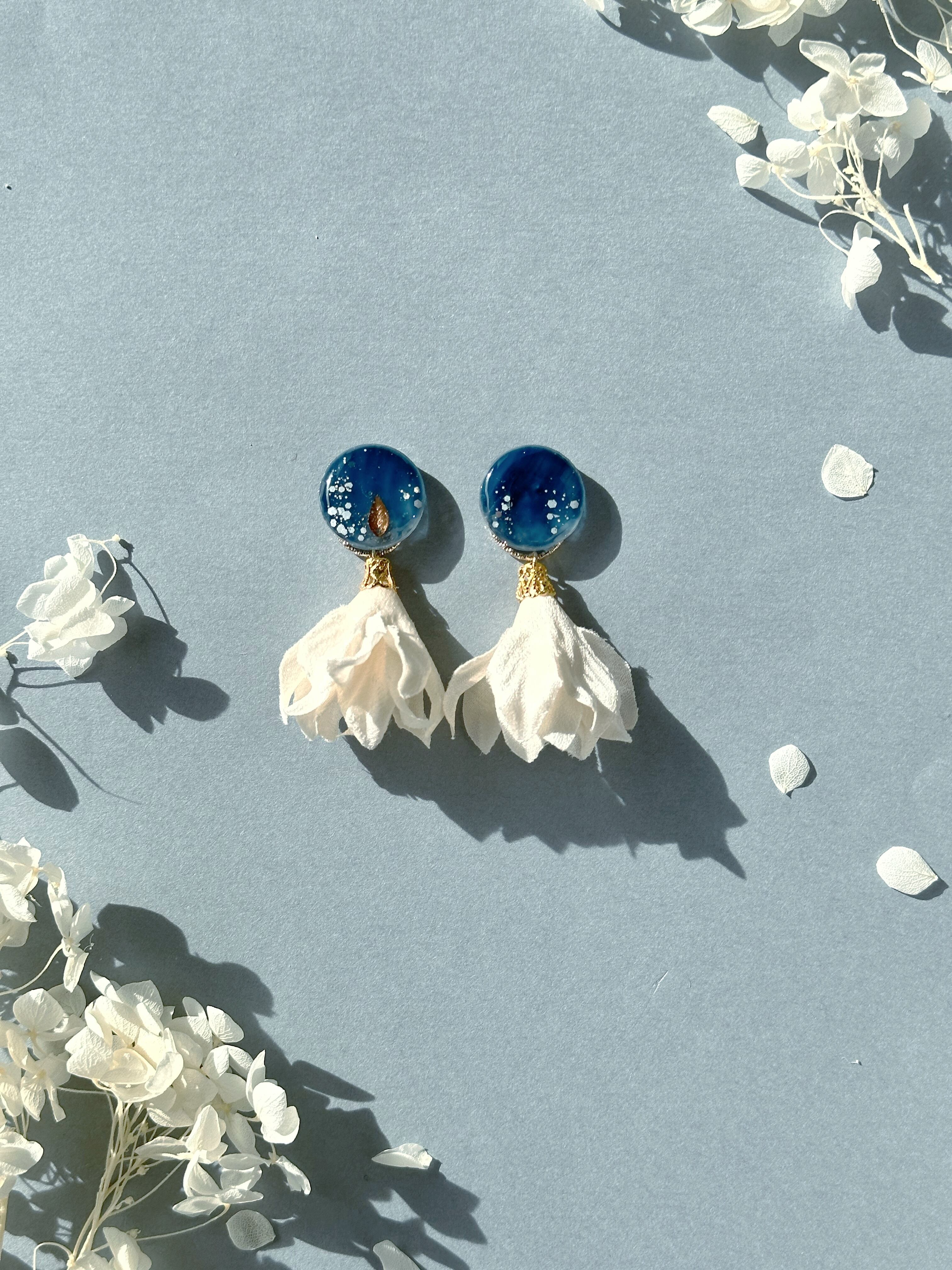 また桜は白い垂桜のため、背景の藍色がよく映えています。