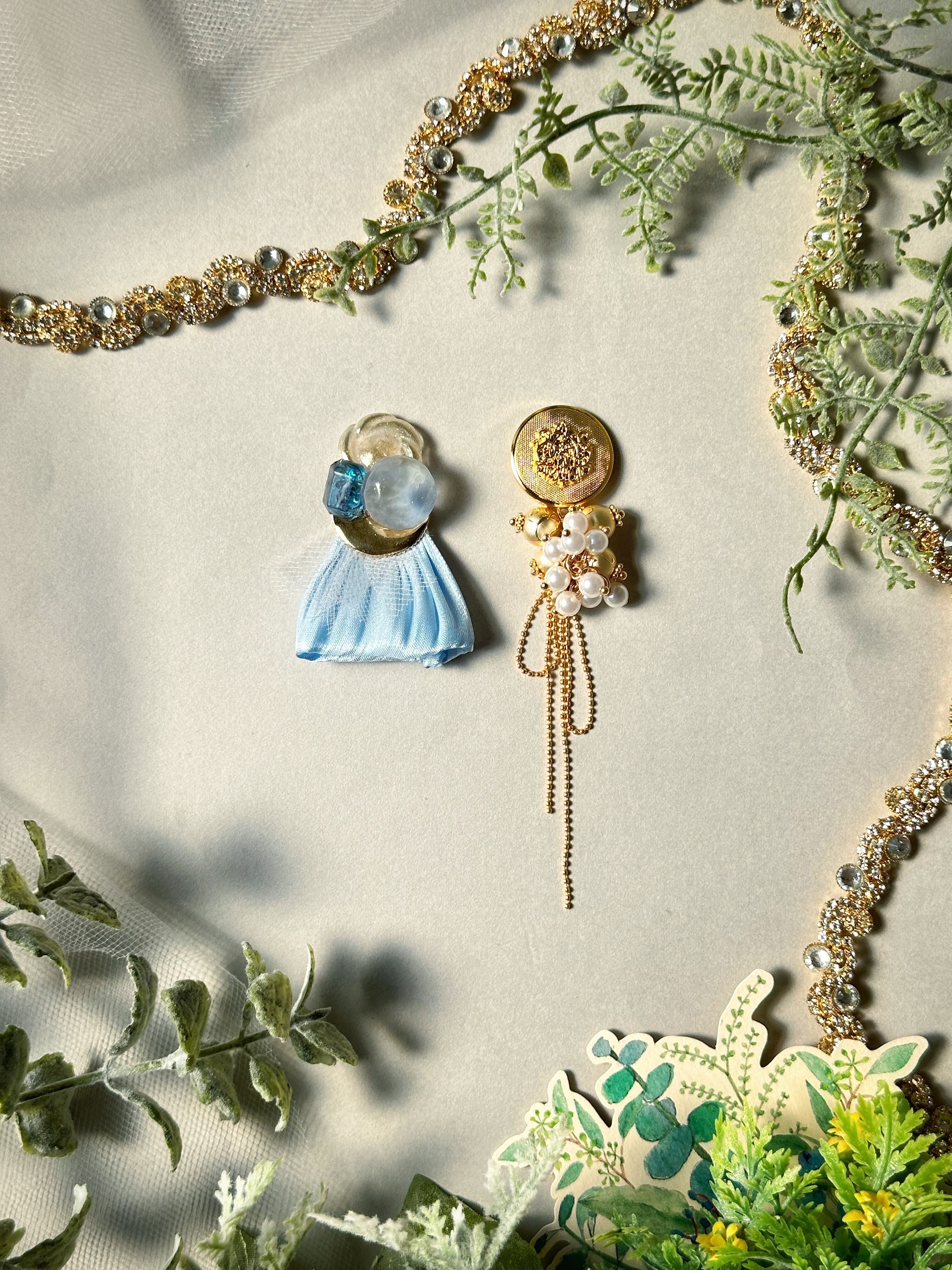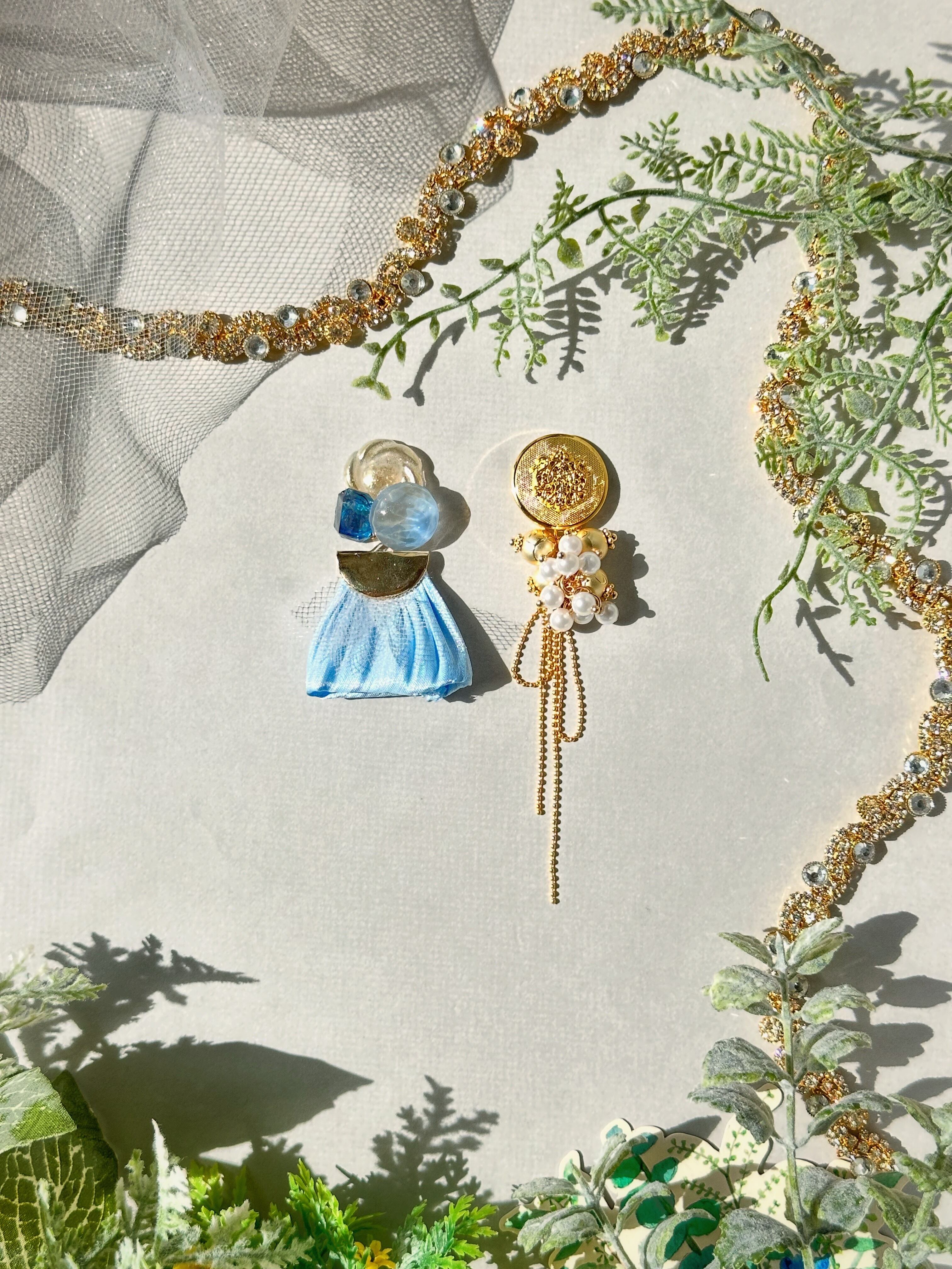 左のカボションは彼女の豊かな髪をイメージしたレジンのビジューで表現し、チャームはサテンのドレスを模したリボンを使用。