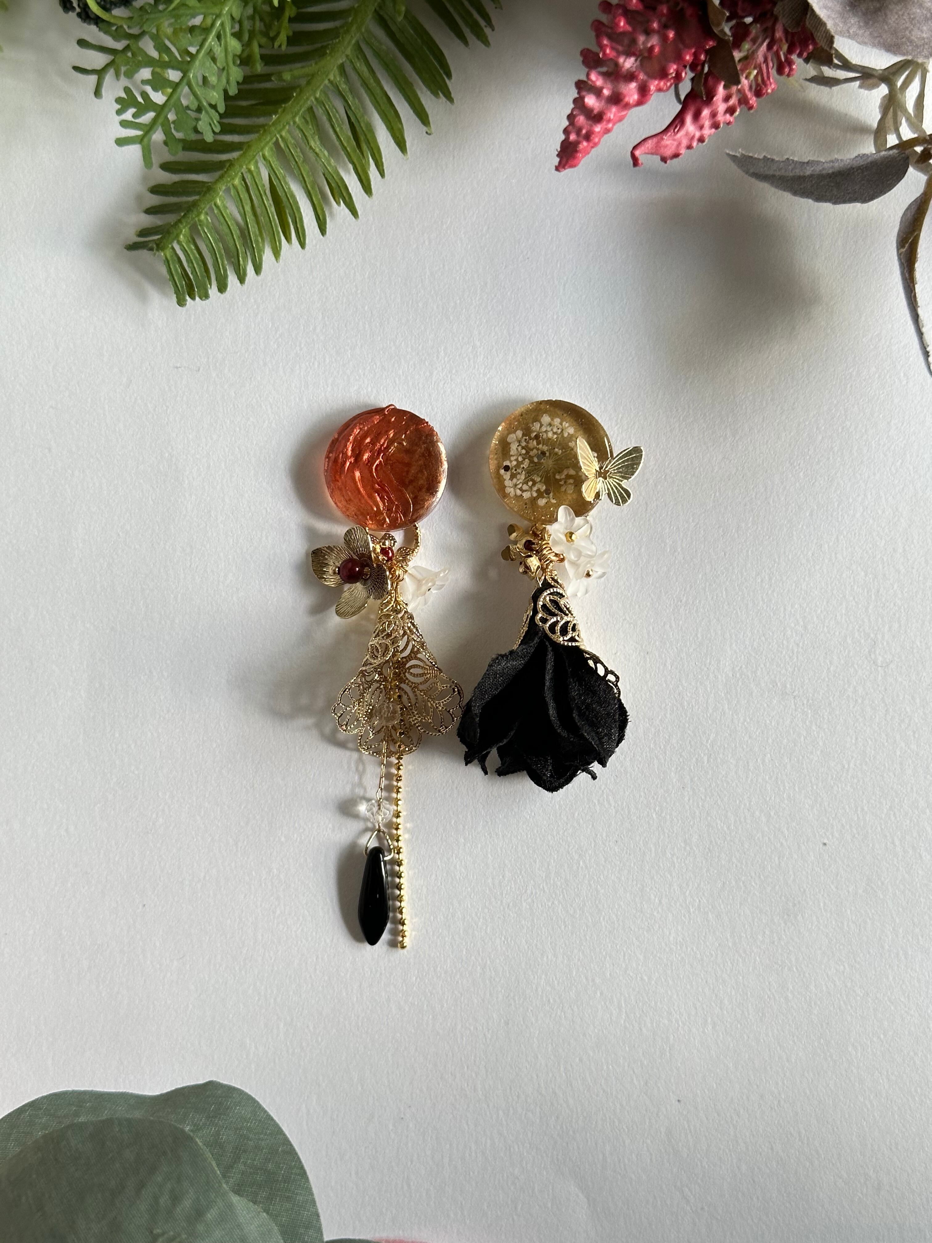 真っ黒な花びらのようなパーツを金の透かしパーツでくるんだチャームに変更することにより、この作品をよりダークなテイストに変更することができます。