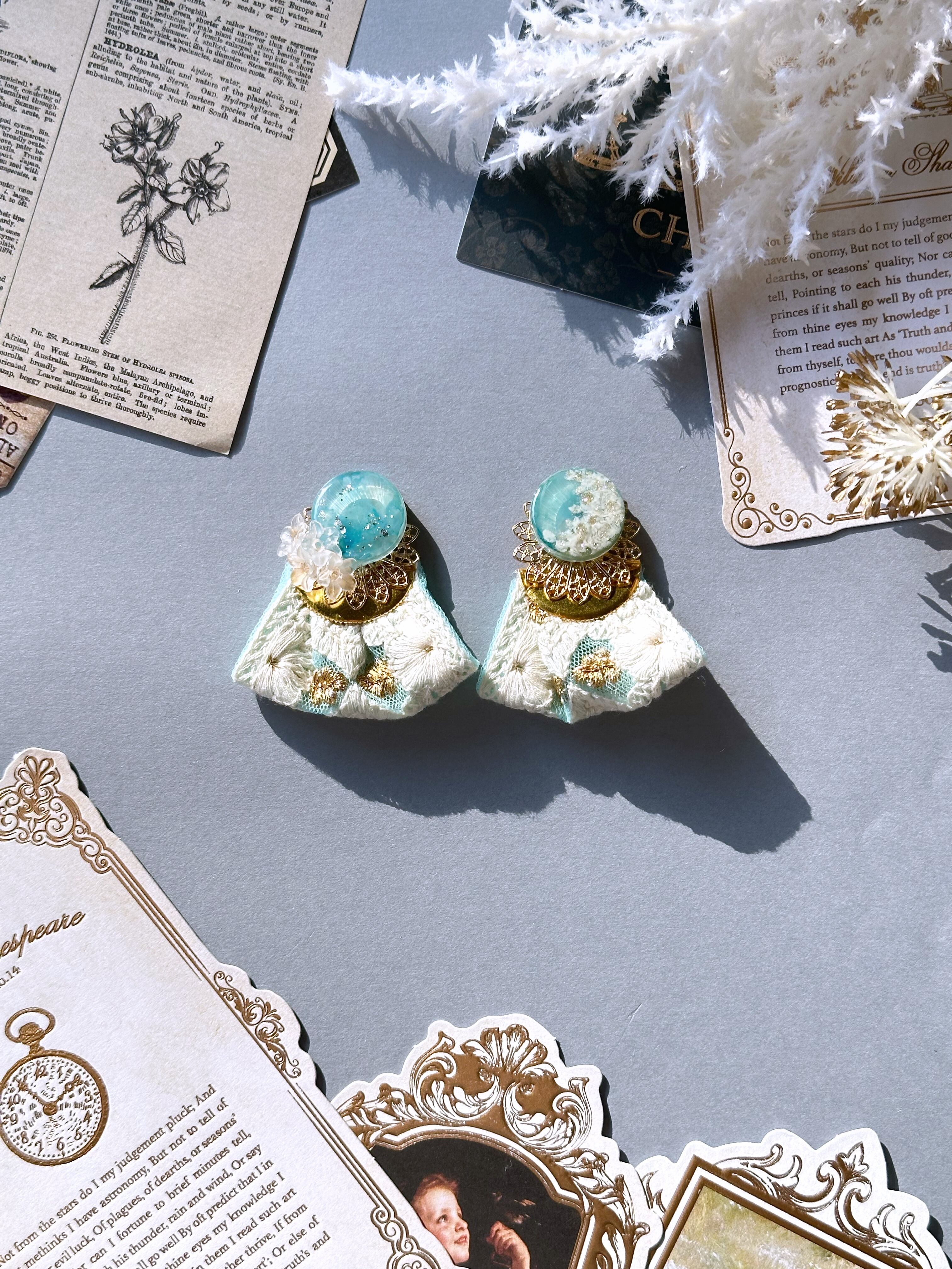 リボンは空の青を感じさせるインドリボンを用い、カボションとの色のつながりを大切にしました。