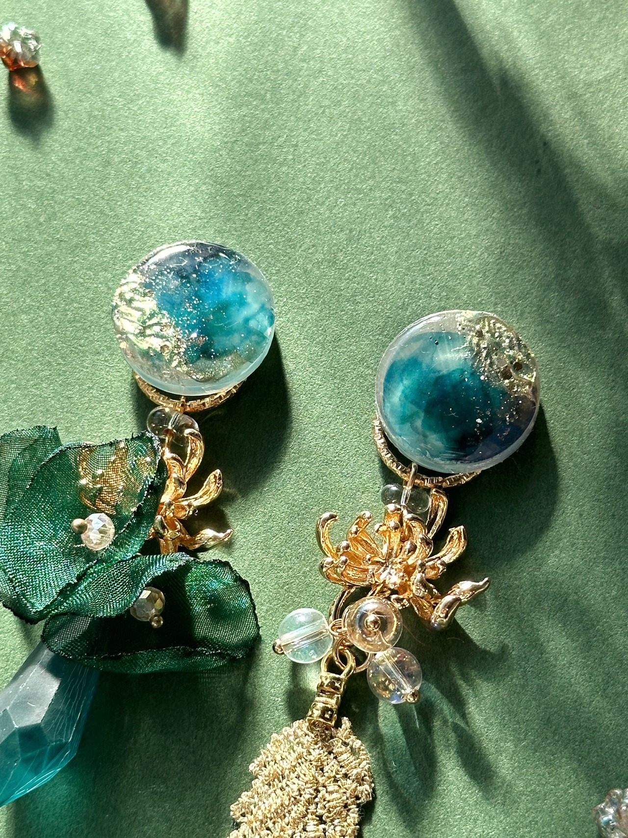 カボションは深い緑の水面を表現するためオイルインクを5色以上重ねています。