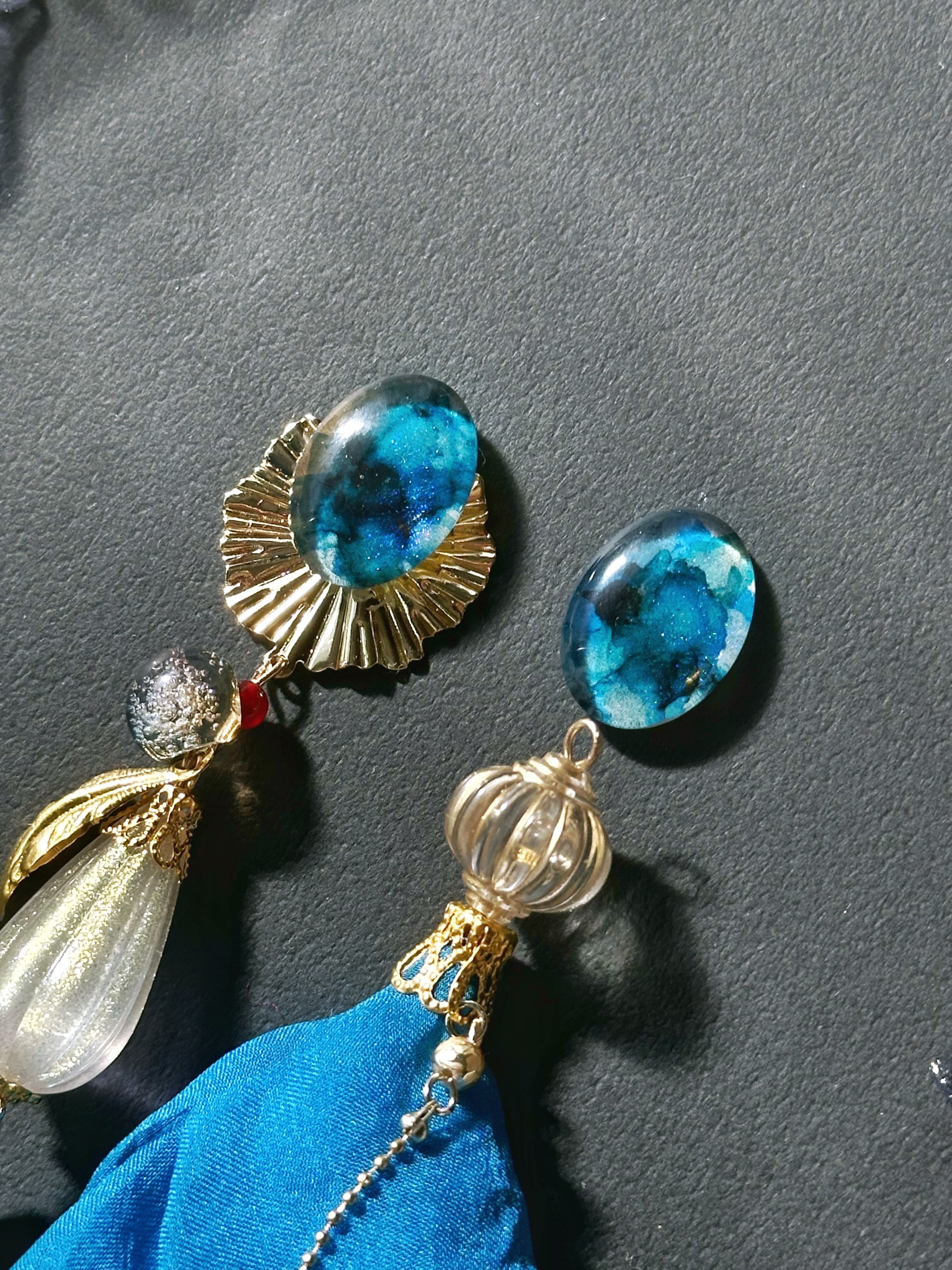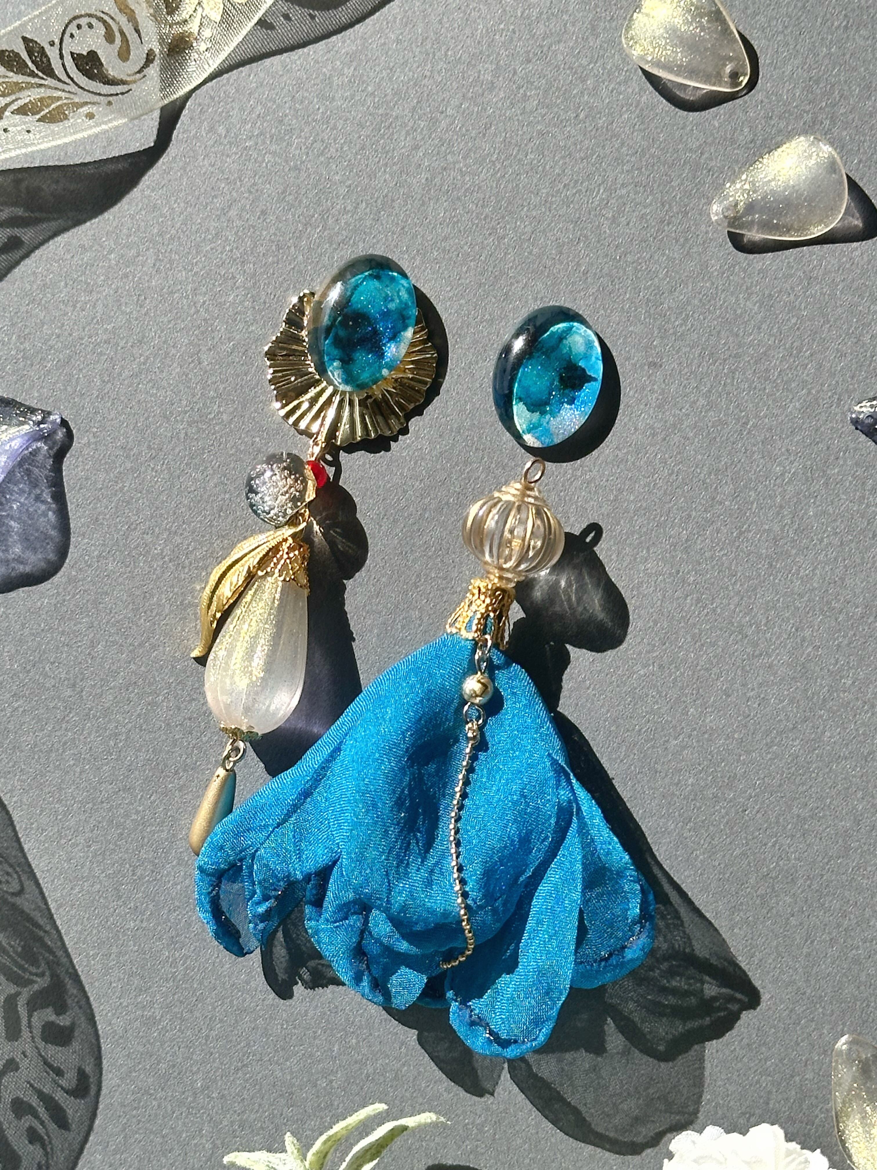 また、女性の右側に垂れ下がるブルーのカーテンを全体的にアクセサリーに落とし込み、特に右のチャームのシフォンはその質感を表現しています。