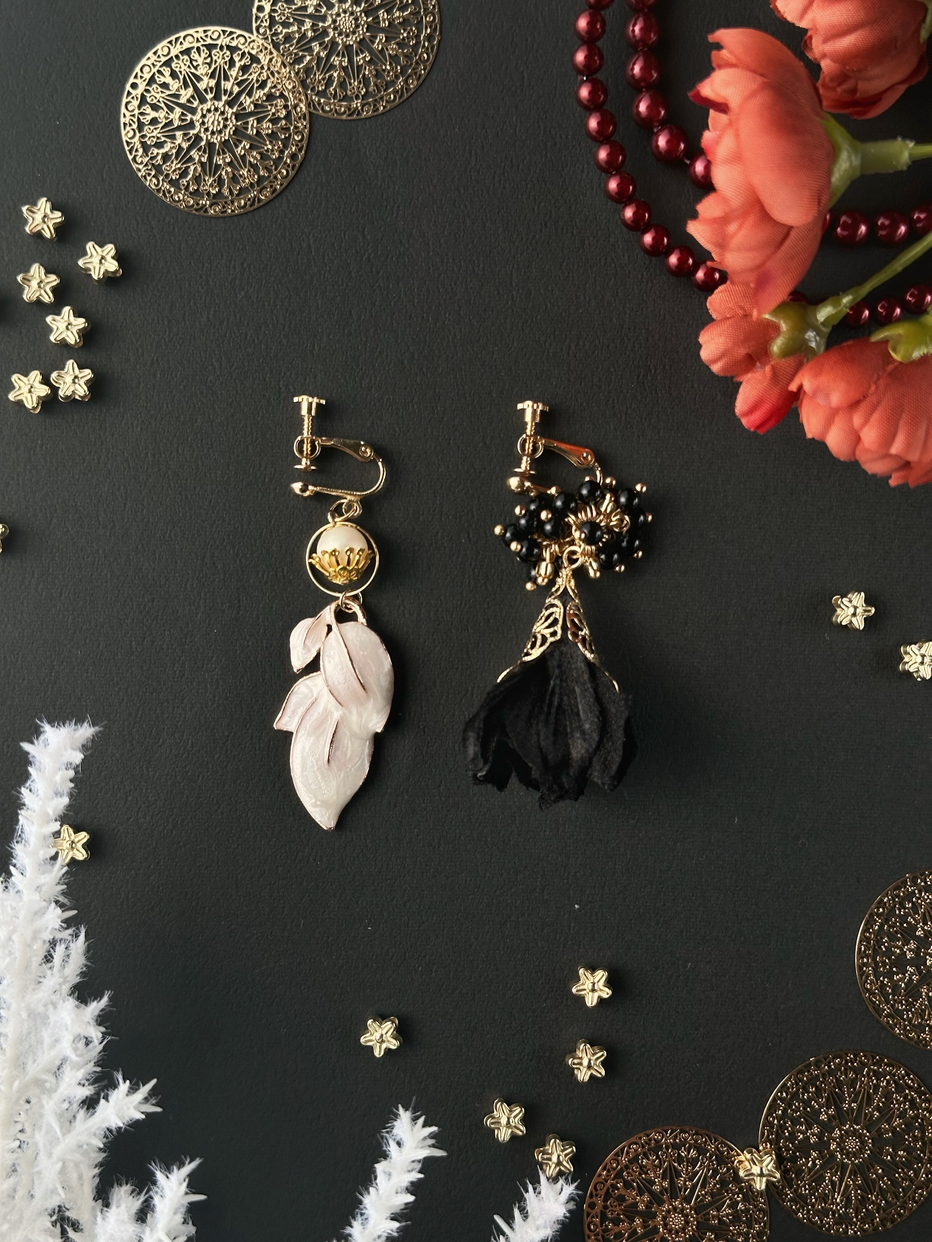 白と黒という対比がインパクトのあるアクセサリーのため、それぞれが過度に装飾的になりすぎないようにバランスを取っています。