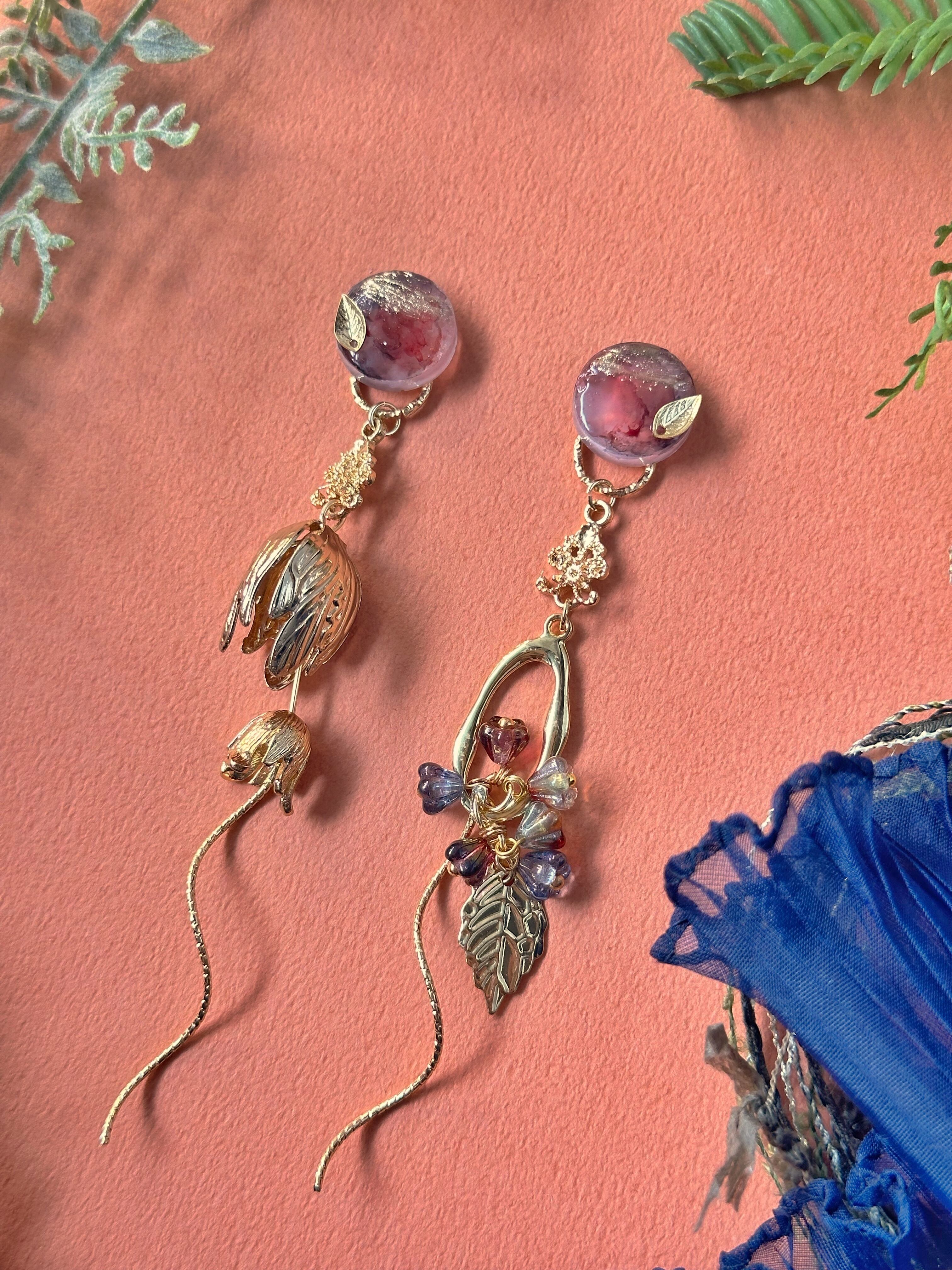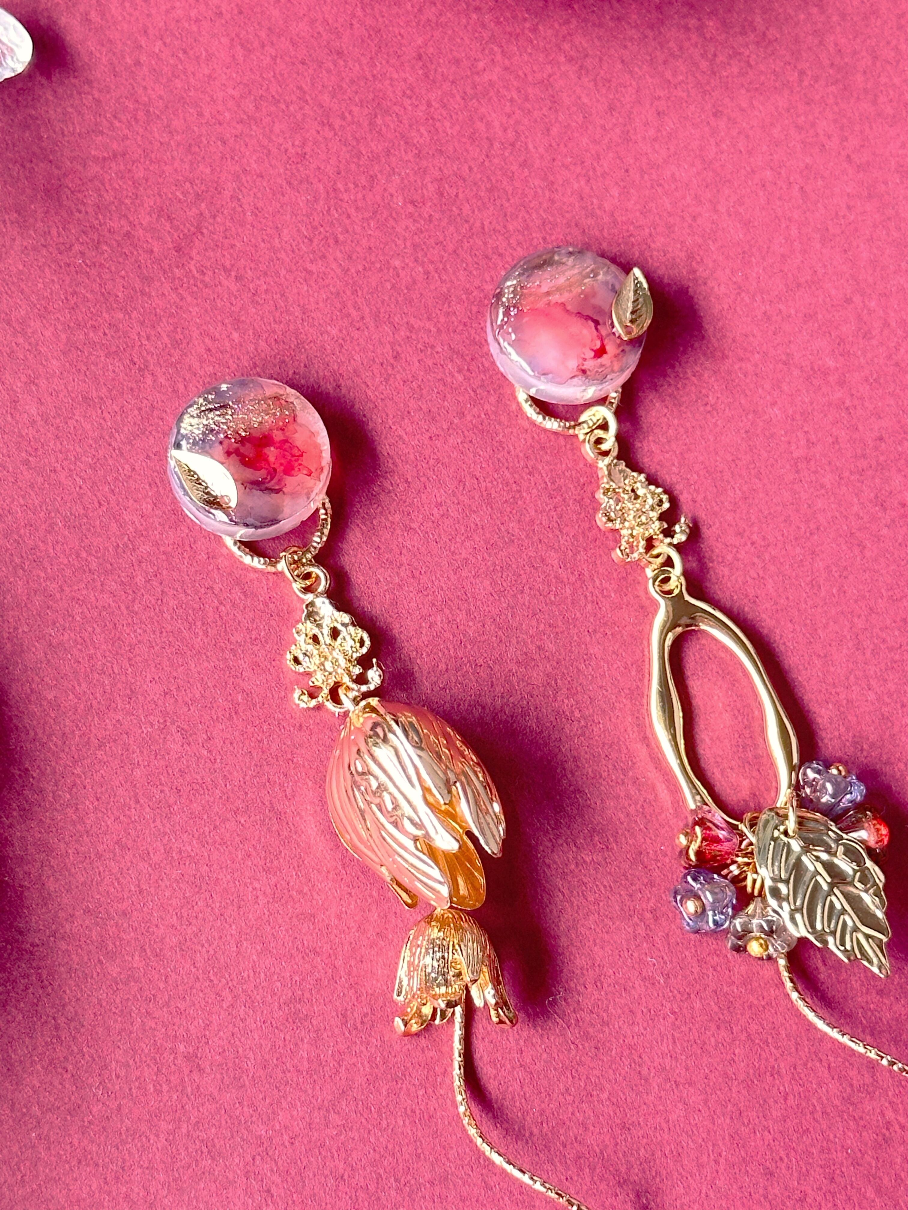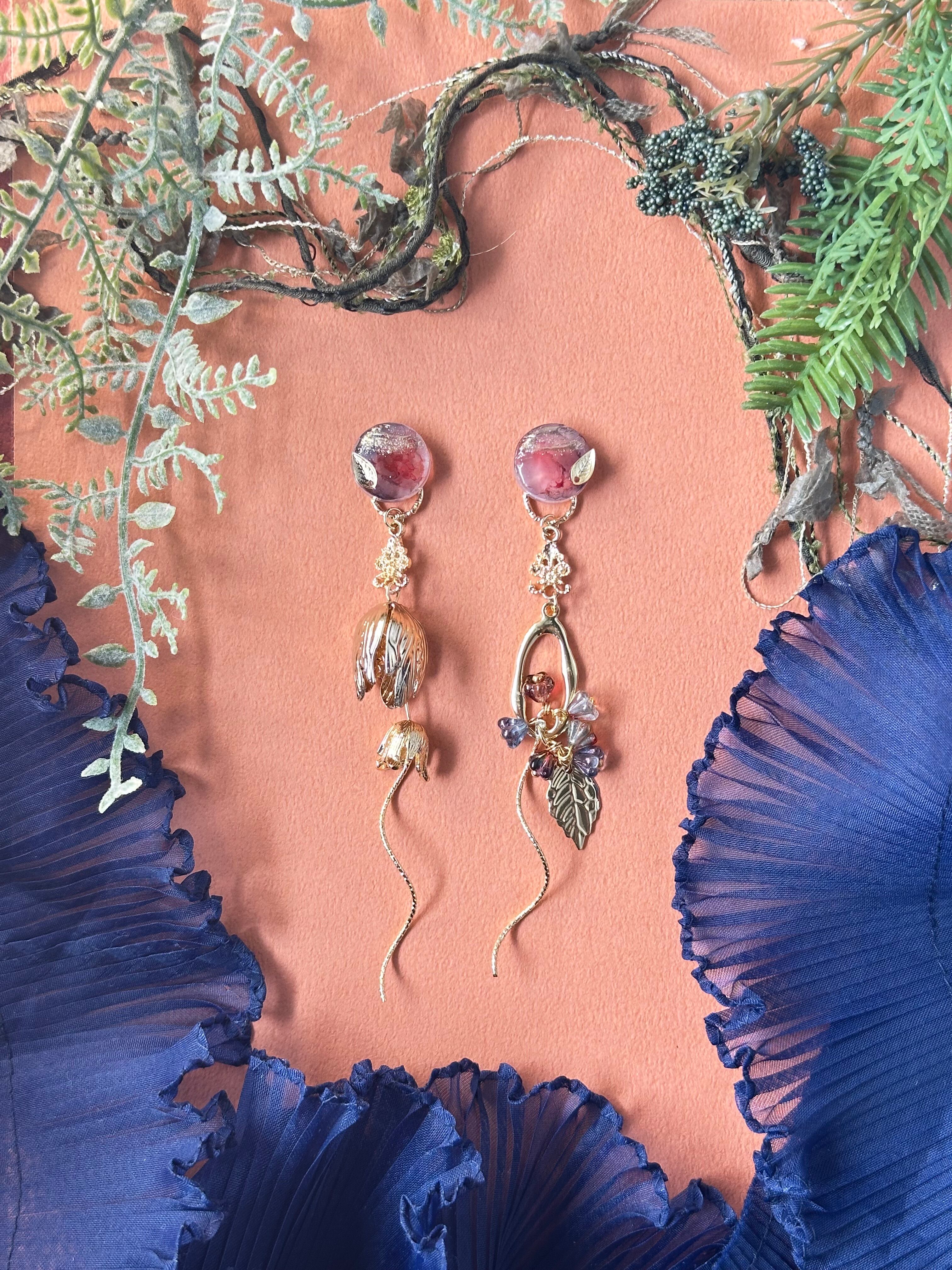 リキッドオイルで滲ませた赤と黒のグラデと滲み具合、そのカボションを抱える(左右から押し包むような)リーフパーツは耳を塞ぐ姿(手)を模しています。