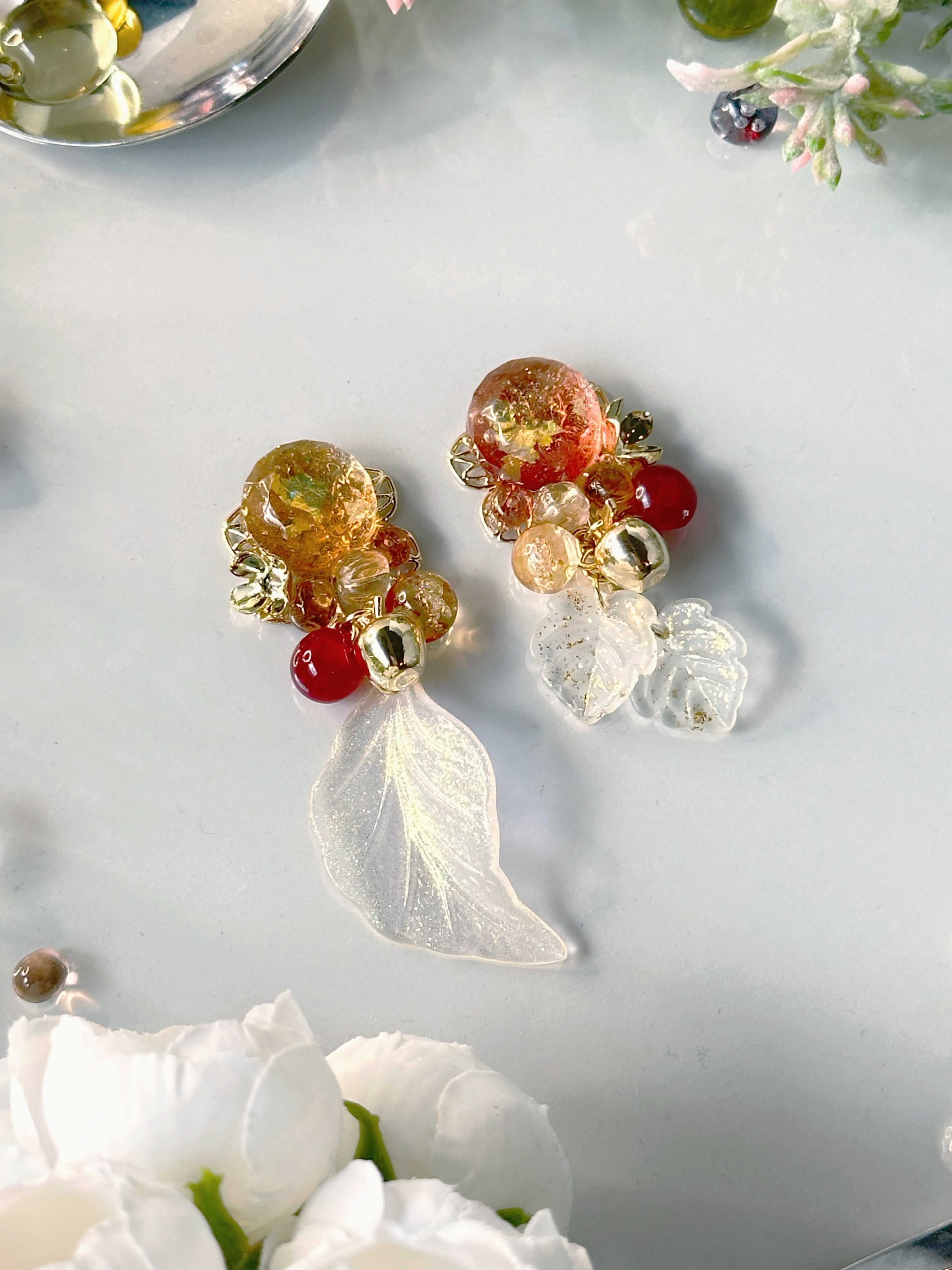 今回はこのリンゴとオレンジを特にモチーフとして引き継ぎ、左のカボションはオレンジ、右のカボションはりんごを表現し、各チャームにリンゴやオレンジをイメージしたビーズをぶら下げています。ゴールドのチャームはリンゴそのものの形になっており、全体でセザンヌの描いた複数の果物の密集感を表現してみました。