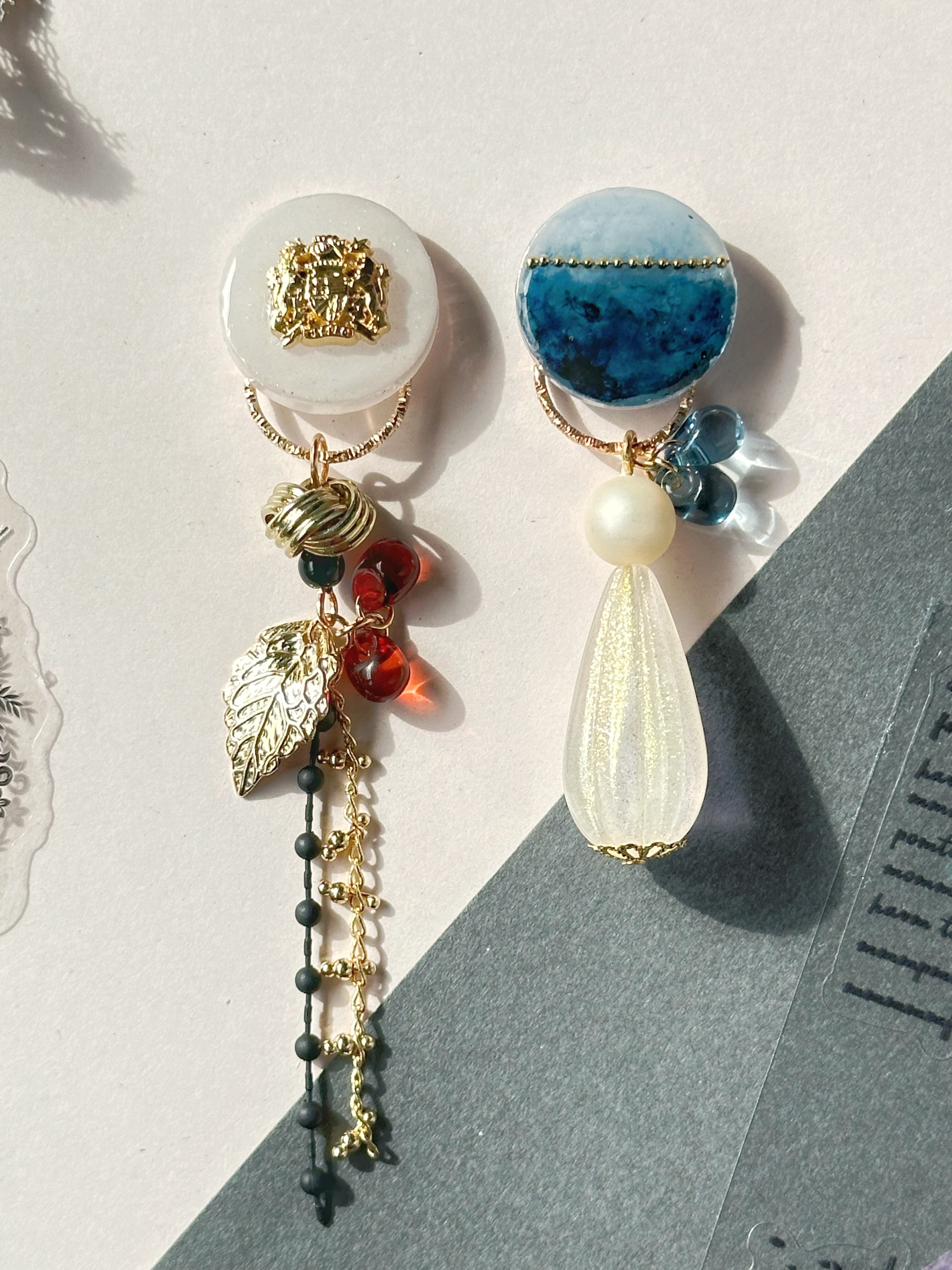 一方右のカボションも彼女の身にまとう衣装の青の色味を反映し、チャームは小さな白貂の頭部、ドロップビーズは白貂の体を模しています。