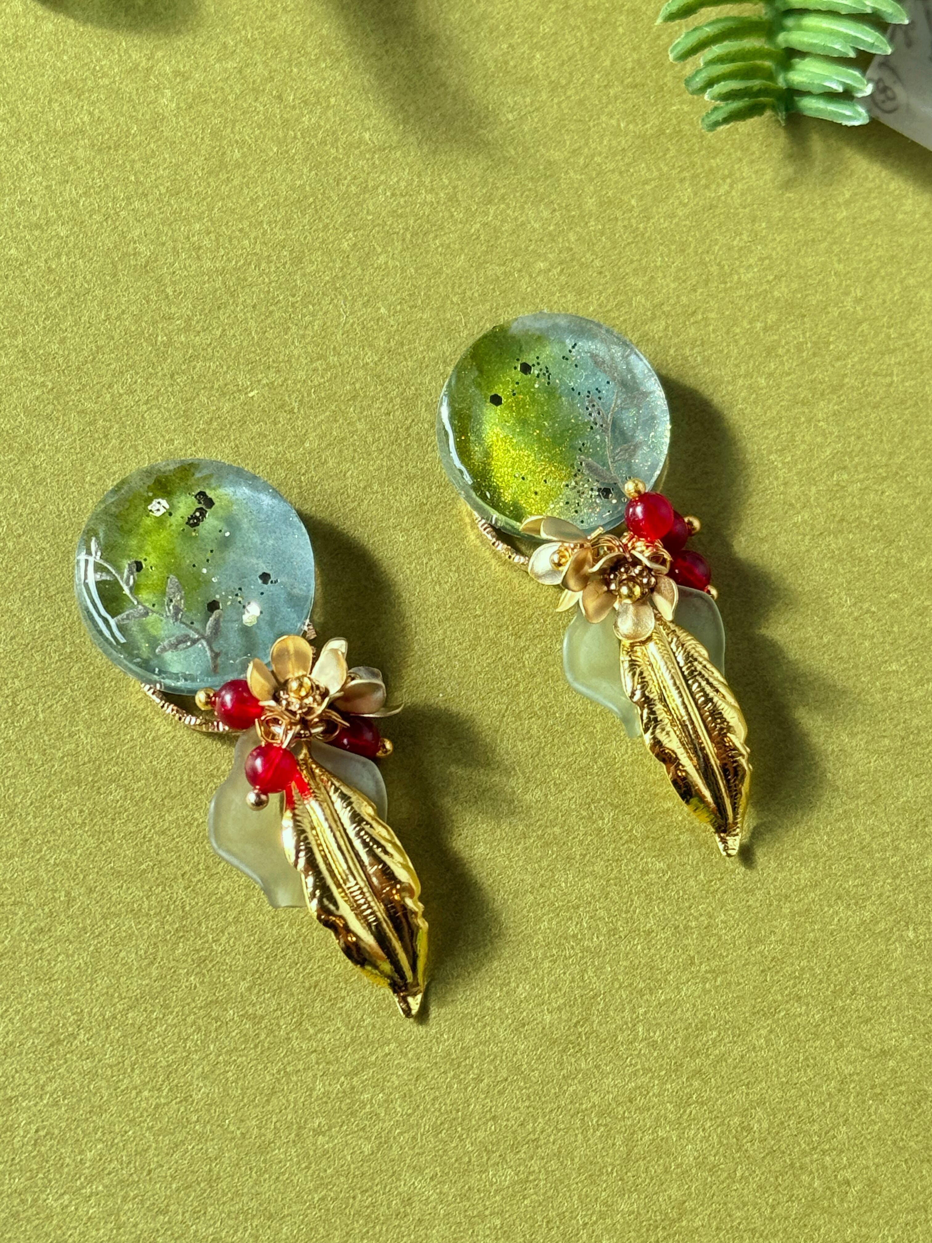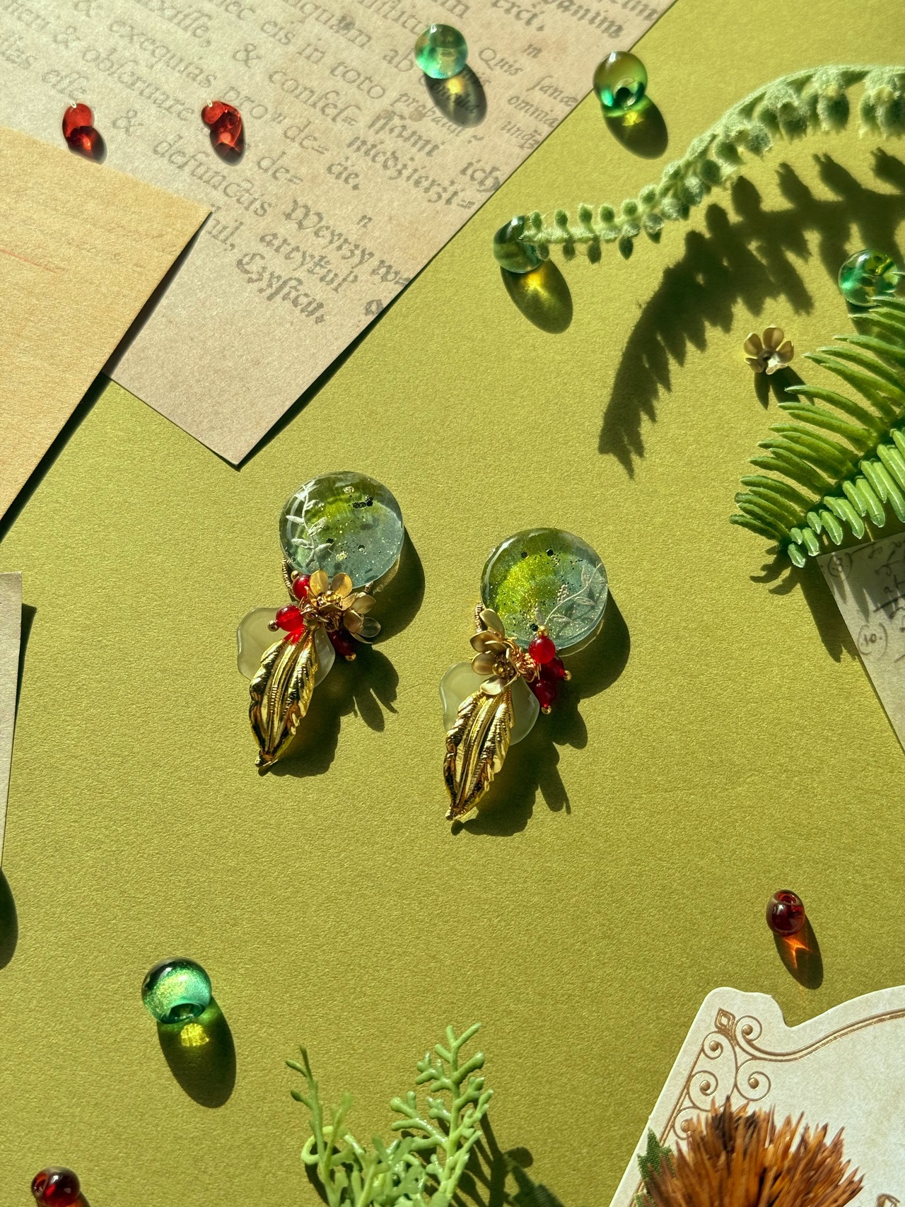 そして、その下には緑のフロストフラワーパーツと金色のリーフチャームをぶら下げ、青、緑、赤、金だけで構成した柔らかでそして華やかな作品に仕上げています。