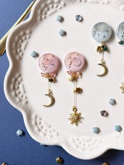チャームには煌めく星と月をぶら下げてみましたが、すこしだけメランコリーな雰囲気もだしてみたくてピアノ線をつかってゆらゆら揺れる感じにつくっています。また月は星よりもやや高め(ピアノ線を短く)にして、お月さま優位な感じです。やはりお月さまは高く光り輝いてほしいですよね。