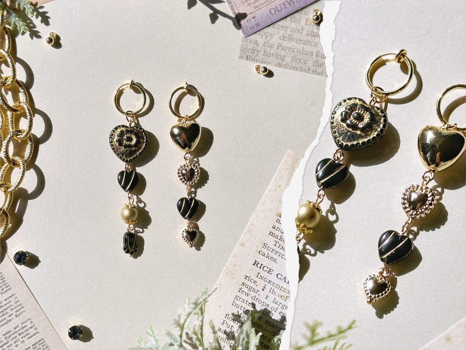 黒いハートのチェコビーズをところどころに使い、耳元でゆらゆら揺れるとこの黒色が映える作品です。