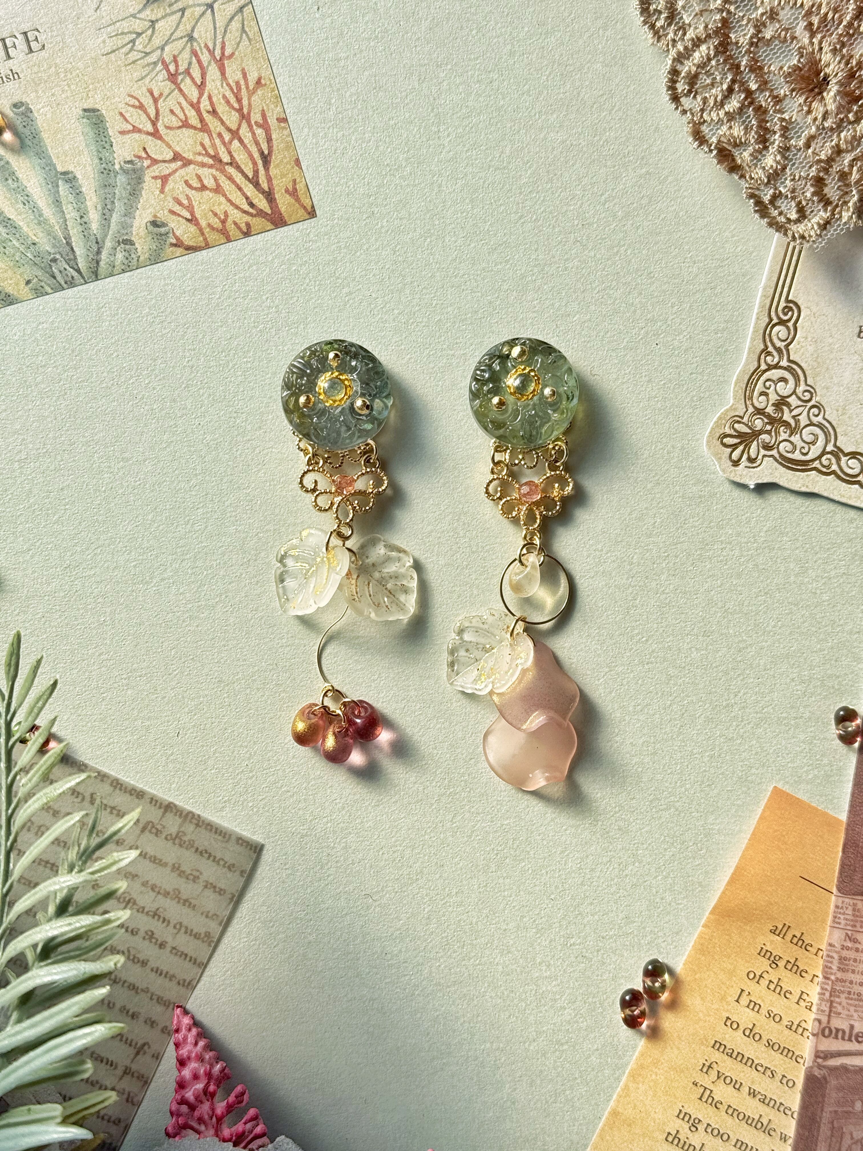 カボションには宝石のようなモチーフを真ん中に配置し、チャーム部分は女性の肩に揺れるフリルをイメージしたメタルパーツをつなげ、ところどころアクセントに使われている赤い装飾品を模したビーズを飾りました。